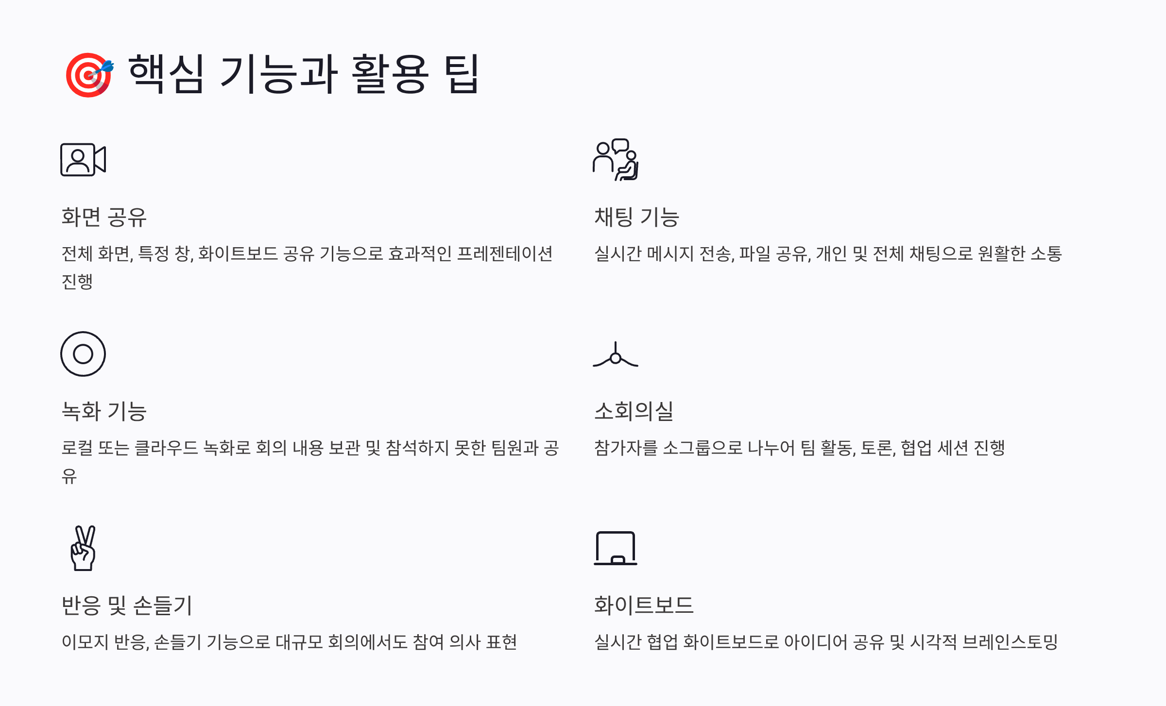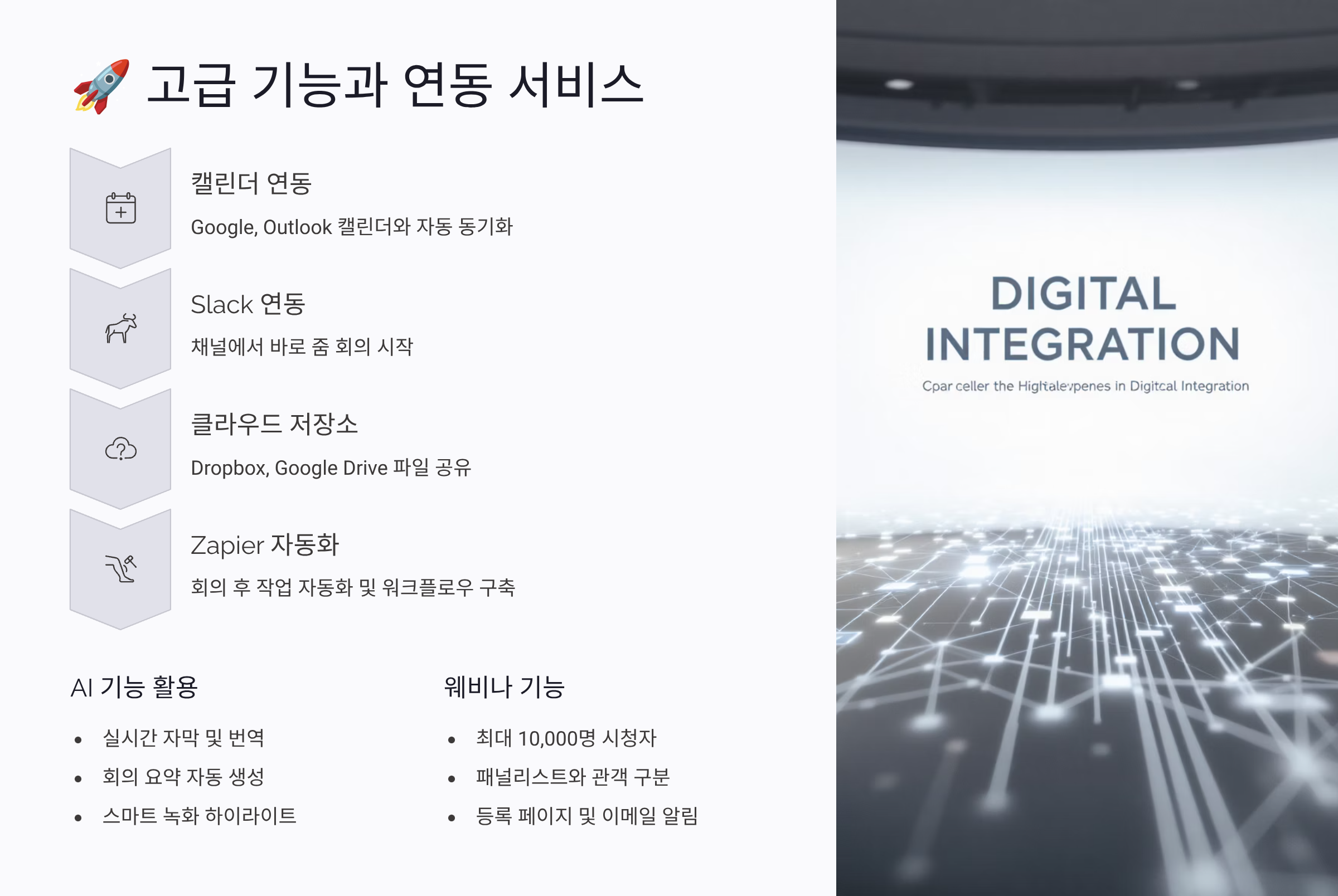 녹화 기능도 놓치지 마세요. 로컬 녹화는 무료 계정에서도 가능하고, 프로 계정은 클라우드 녹화를 지원해요. 클라우드 녹화의 장점은 자동 트랜스크립트 생성, 링크 공유, 하이라이트 편집 등이 가능하다는 거예요. 회의 후 참석하지 못한 팀원들과 공유하거나, 교육 콘텐츠로 활용하기에 perfect 해요! 🎬