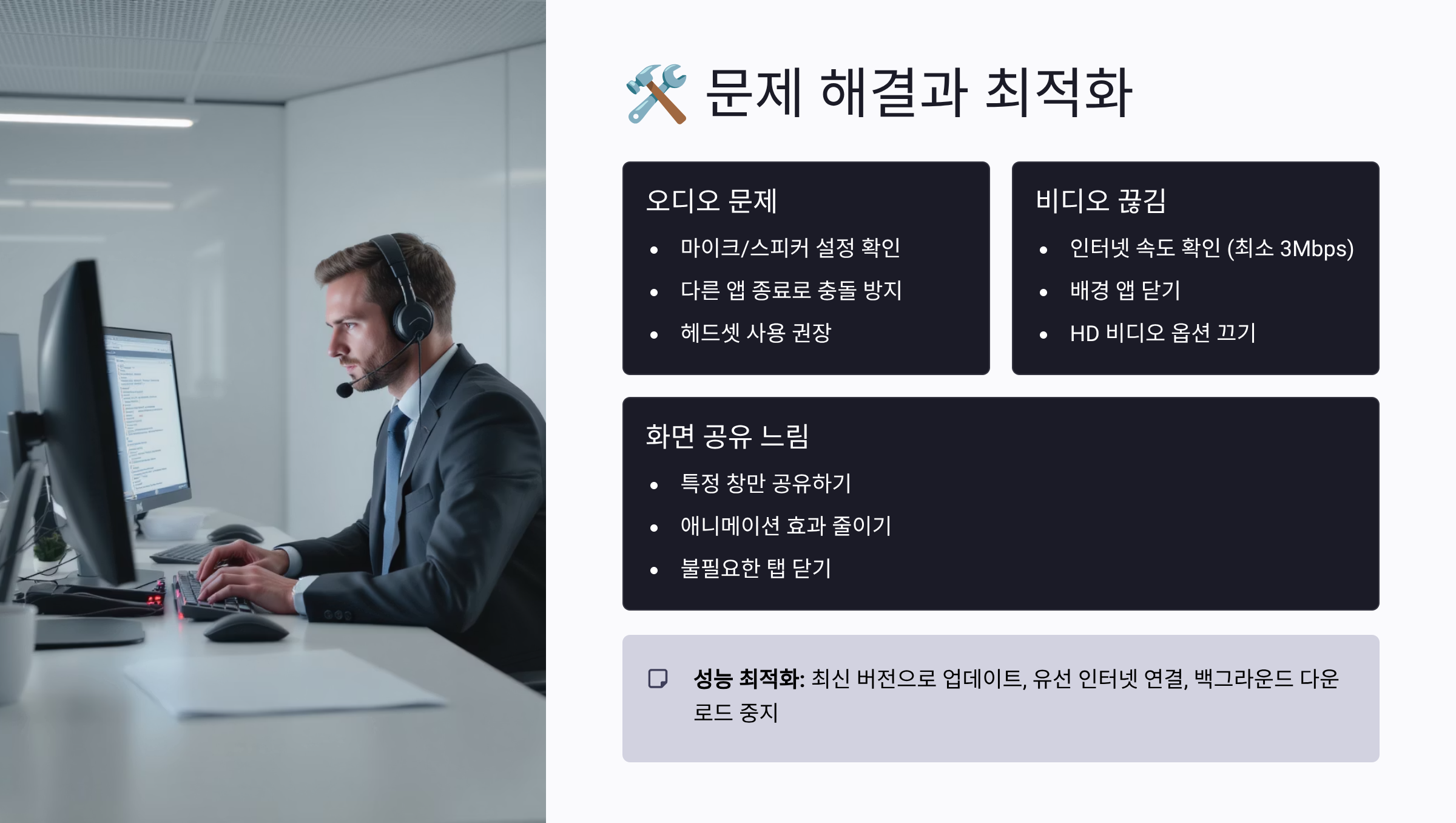 비디오 품질 문제는 주로 인터넷 속도나 컴퓨터 성능 때문이에요. HD 비디오는 상향 1.8 Mbps, 하향 1.8 Mbps의 속도가 필요해요. 속도가 부족하다면 SD 화질로 낮추거나, 불필요한 프로그램을 종료해서 리소스를 확보하세요. 가상 배경도 CPU를 많이 사용하니 성능이 낮은 컴퓨터에서는 비활성화하는 게 좋아요.