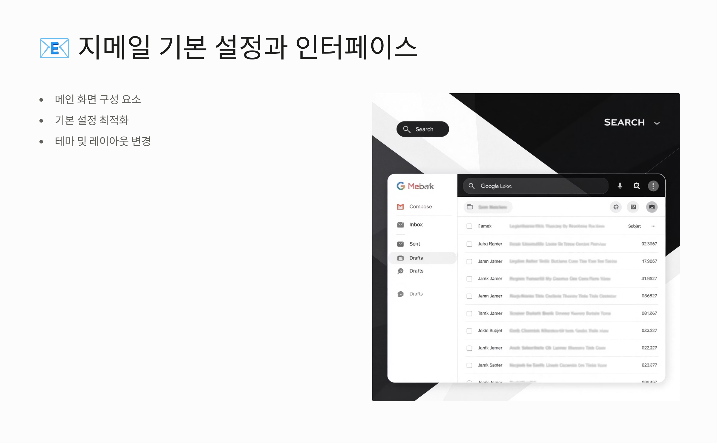 지메일 인터페이스는 크게 세 부분으로 나뉘어요. 왼쪽에는 받은 편지함, 보낸 편지함, 임시보관함 등의 메뉴가 있고, 가운데는 이메일 목록이 표시되며, 오른쪽에는 구글 캘린더나 구글 킵 같은 부가 기능을 추가할 수 있답니다. 2018년에 도입된 새로운 디자인은 더욱 깔끔하고 사용하기 편해졌어요.