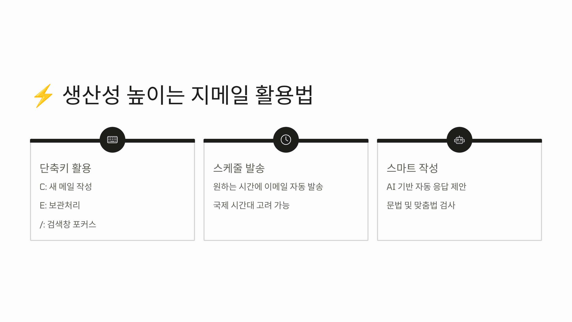 키보드 단축키를 익히면 마우스 없이도 빠르게 이메일을 처리할 수 있어요. 'c'는 작성, 'r'은 답장, 'a'는 전체답장, 'f'는 전달, 'e'는 보관처리 등 자주 사용하는 기능들을 단축키로 실행할 수 있습니다. 설정에서 키보드 단축키를 활성화하고 '?'를 누르면 전체 단축키 목록을 볼 수 있어요.