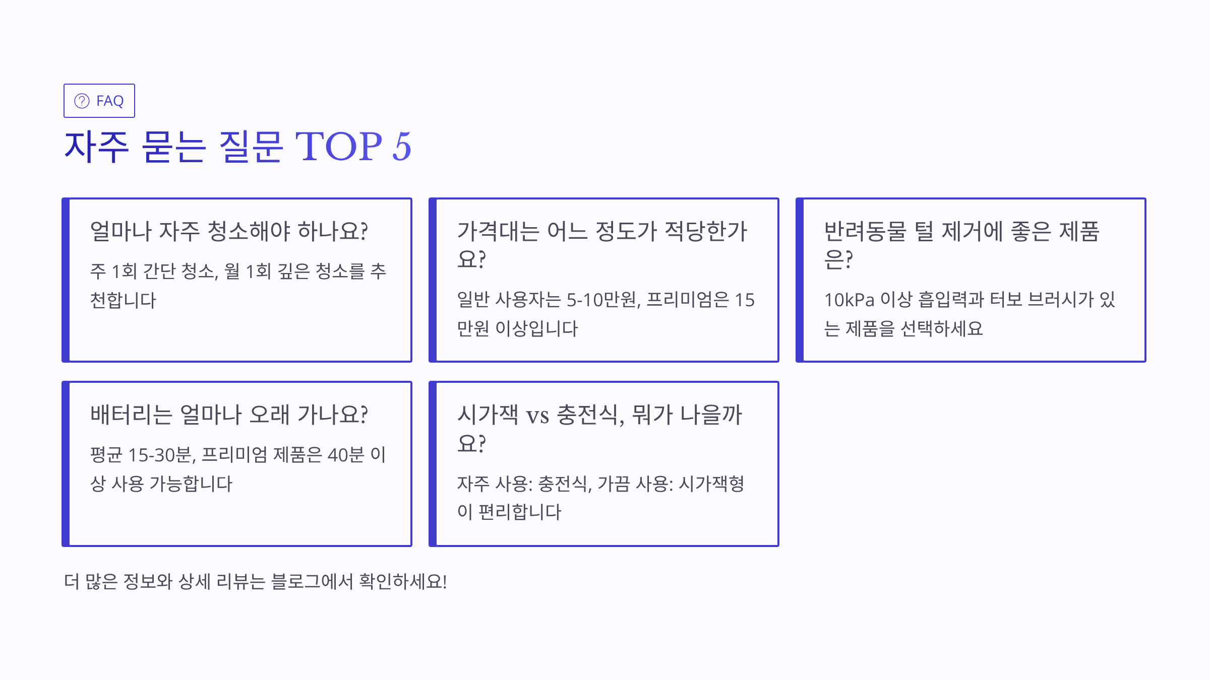 결론적으로 편리함을 중시하고 차량 외에서도 사용하고 싶다면 무선을, 가격을 아끼면서 긴 시간 청소해야 한다면 유선을 선택하세요. 개인적으로는 대부분의 분들께 무선을 추천드려요. 조금 비싸더라도 편리함의 가치가 훨씬 크거든요. 한번 무선을 써보면 유선으로 돌아가기 어려워요!