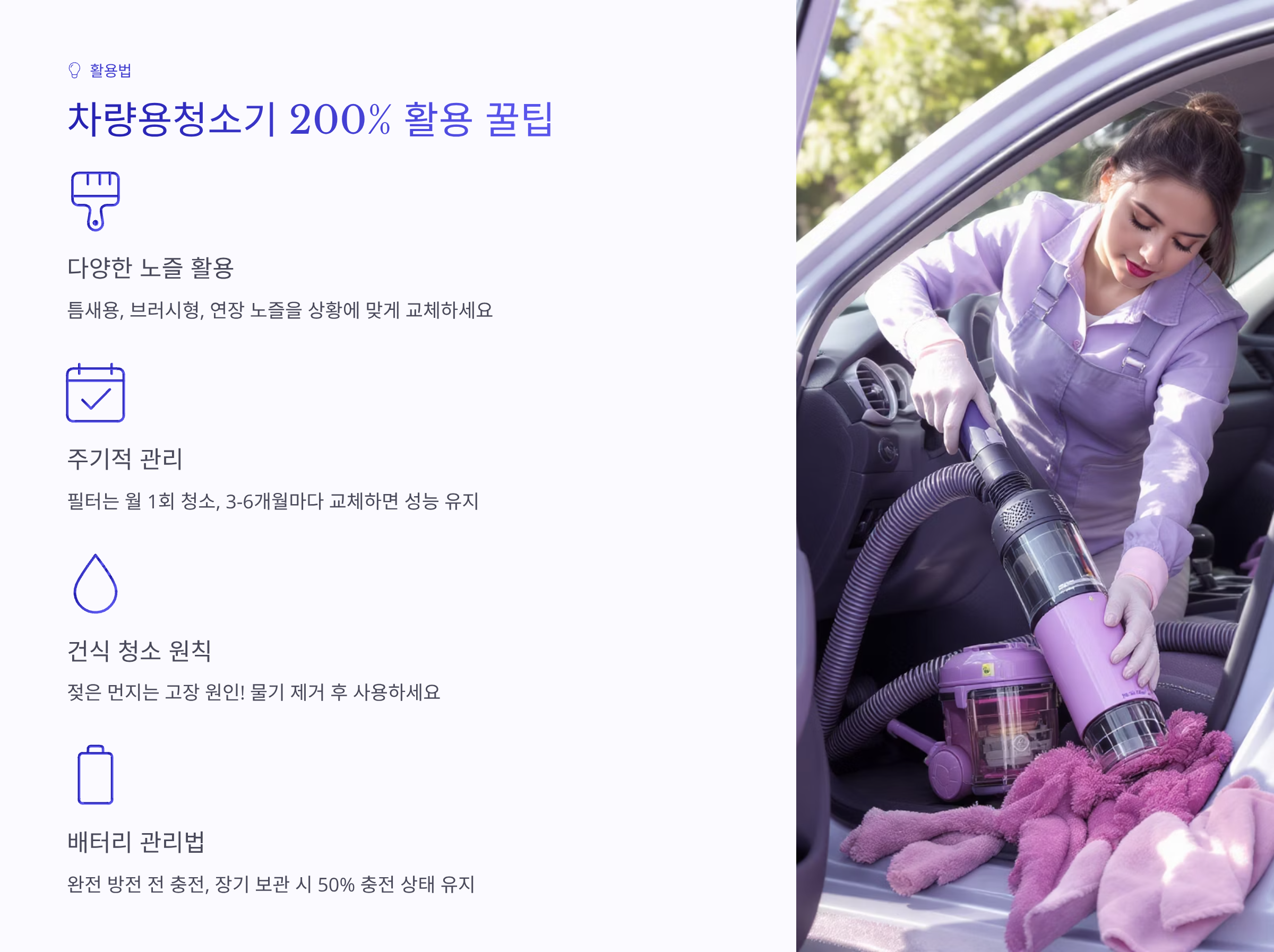 차량용 청소기를 구매하셨다면 제대로 활용하는 방법도 알아야 해요. 같은 제품이라도 어떻게 사용하느냐에 따라 청소 효율이 크게 달라진답니다. 프로들이 알려주는 차량 청소 꿀팁부터 제품 관리법까지 다 알려드릴게요!