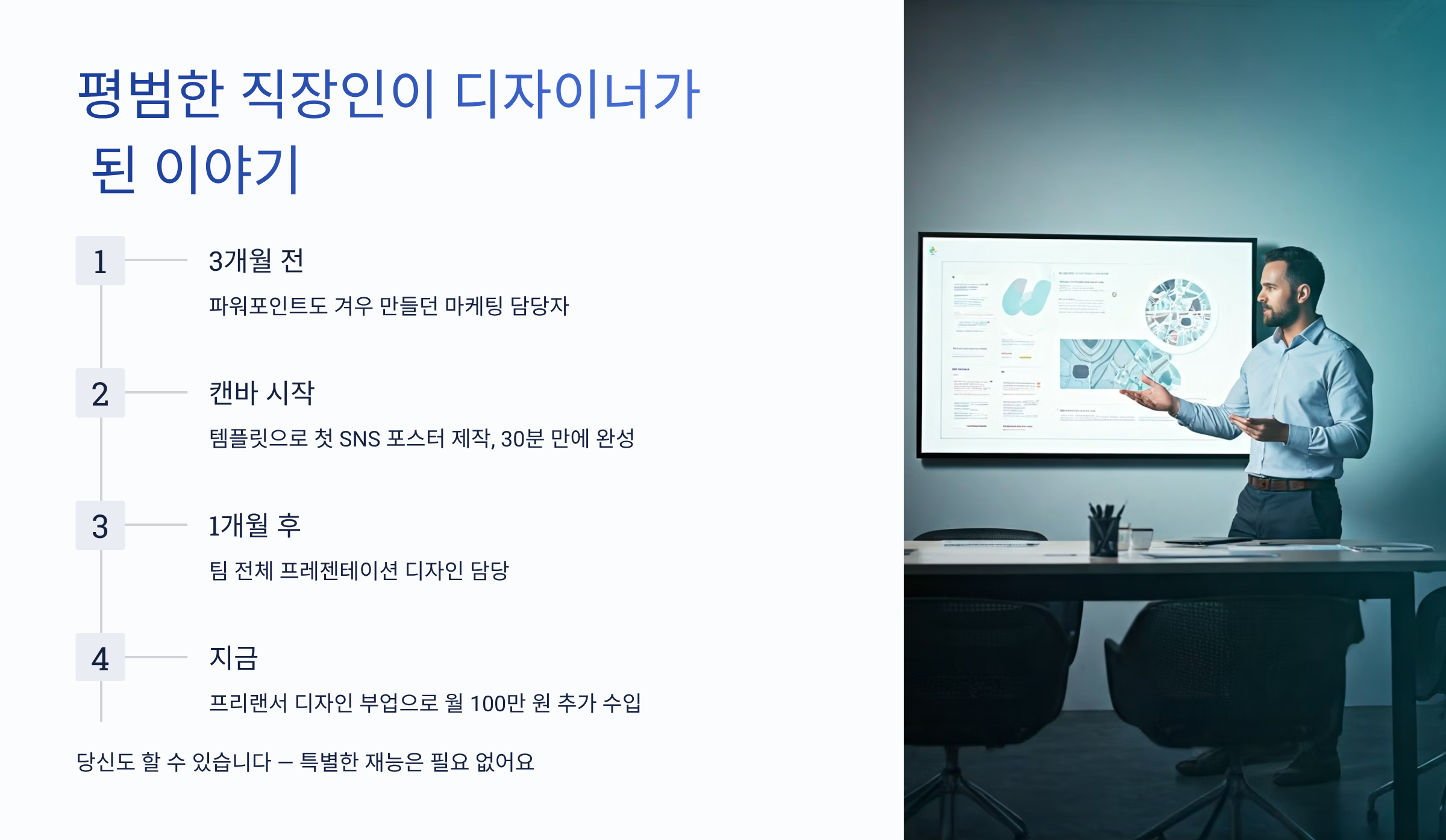 | 직장인 A씨 | 디자인 경험 전무 | 마케팅팀 리더 승진 |