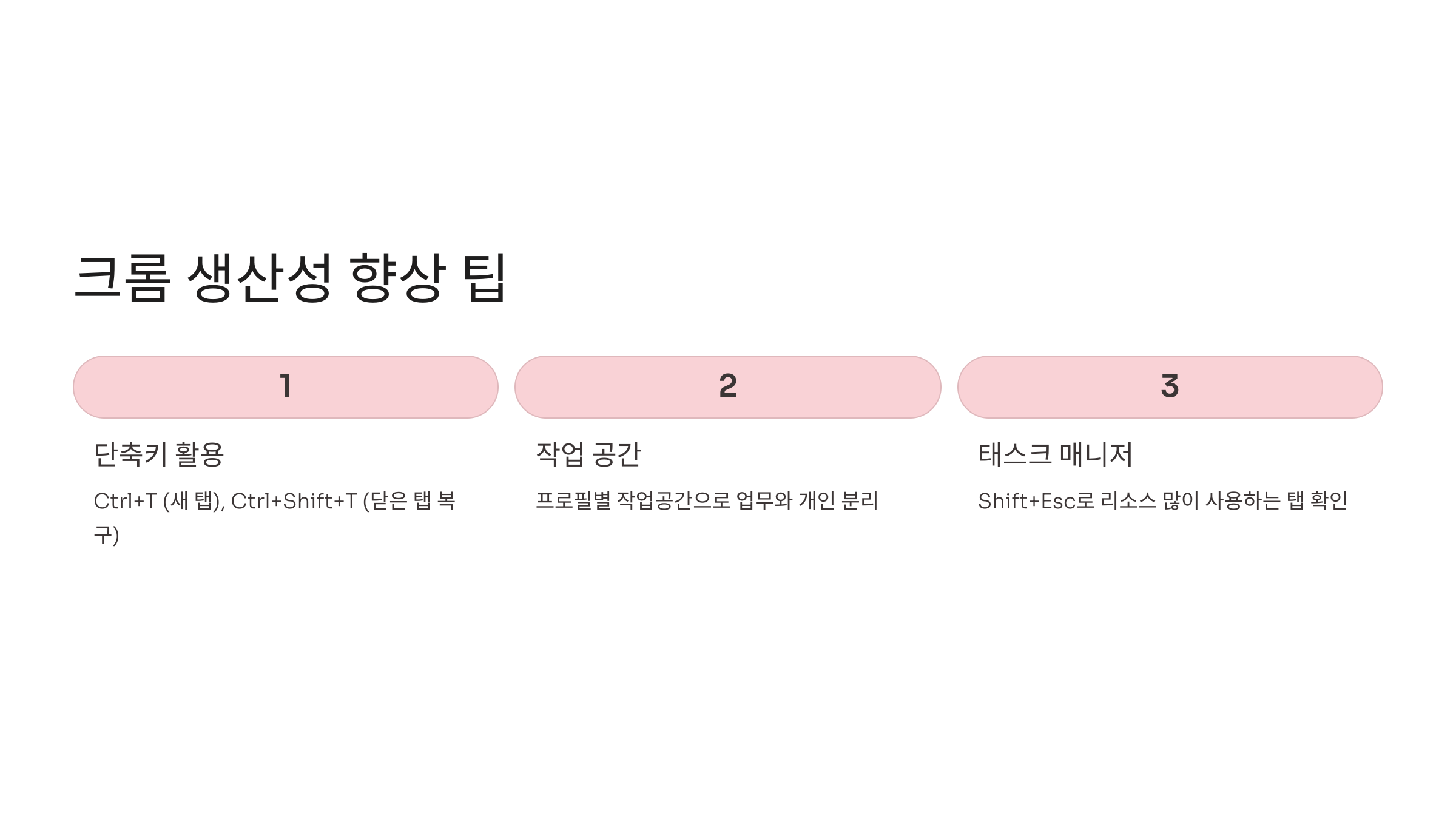 | 작업 관리자 | Shift+Esc | 탭별 메모리 사용량 확인 |