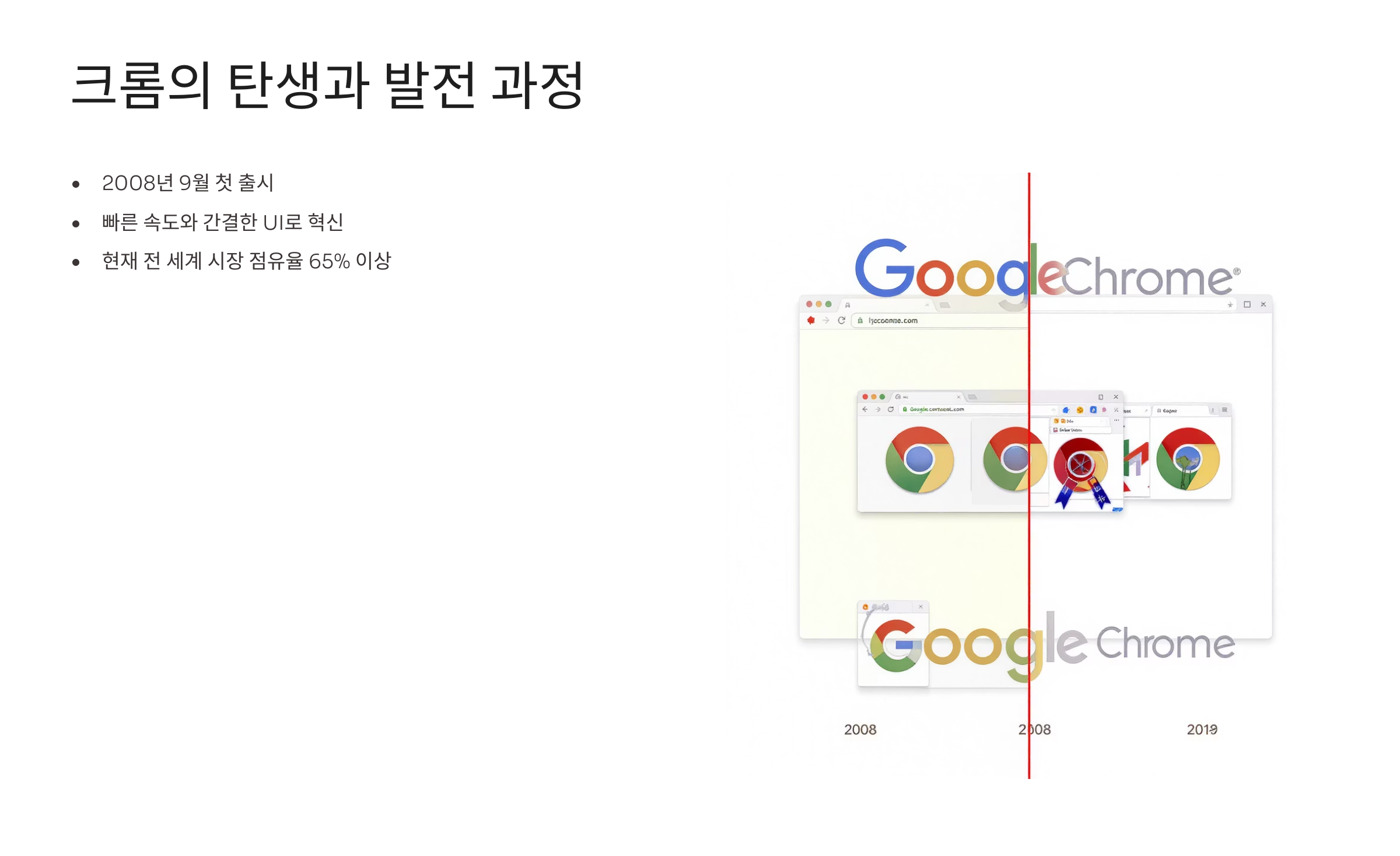 크롬의 역사는 2008년 9월 2일 베타 버전 출시로 시작되었어요. 당시 인터넷 익스플로러와 파이어폭스가 브라우저 시장을 양분하고 있었는데, 구글은 더 빠르고 안전한 브라우저를 만들겠다는 목표로 크롬 개발에 착수했답니다. 크롬이라는 이름은 브라우저의 사용자 인터페이스를 의미하는 용어에서 따온 것이에요.