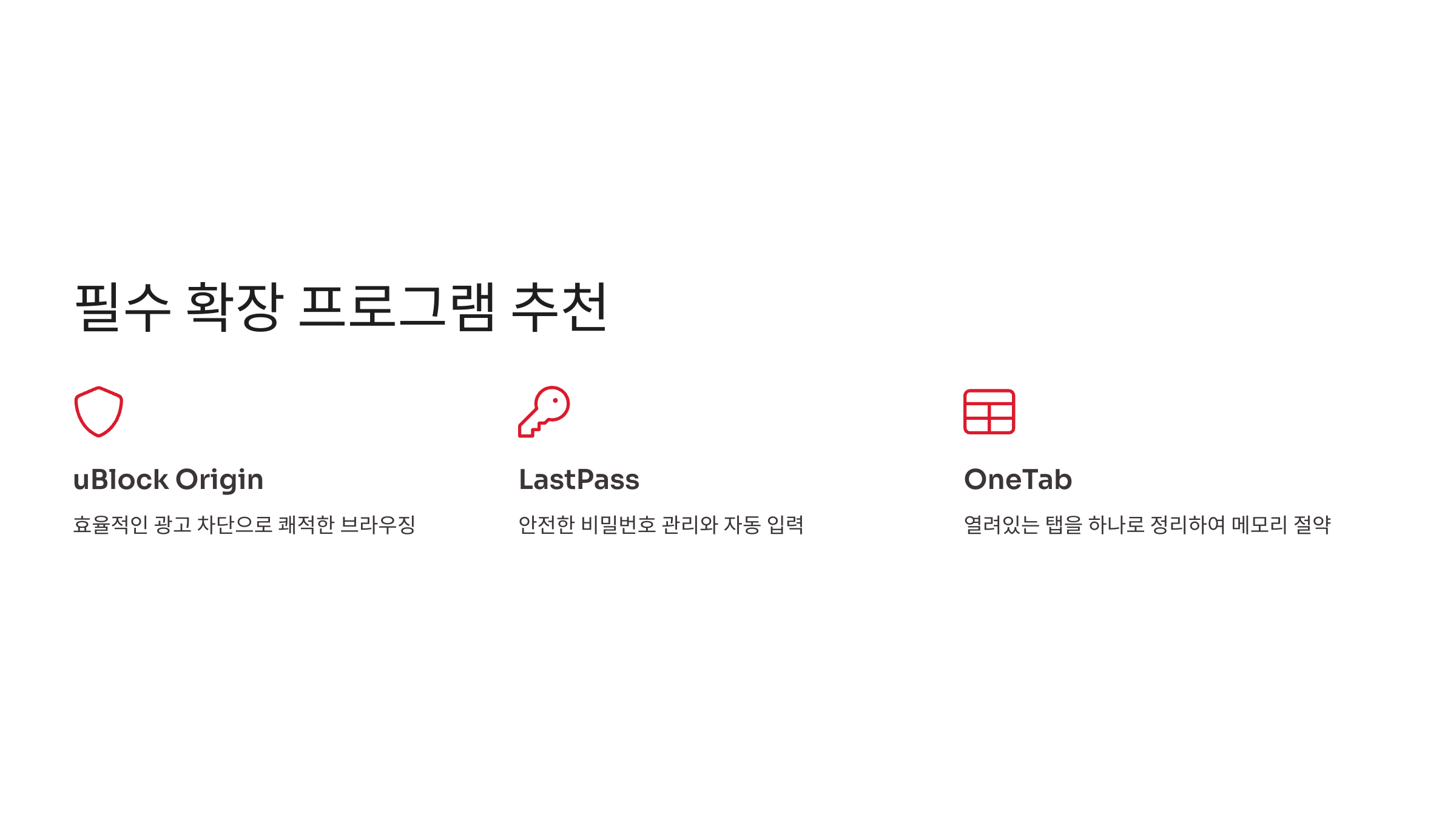 | 카테고리 | 확장 프로그램 | 주요 기능 |