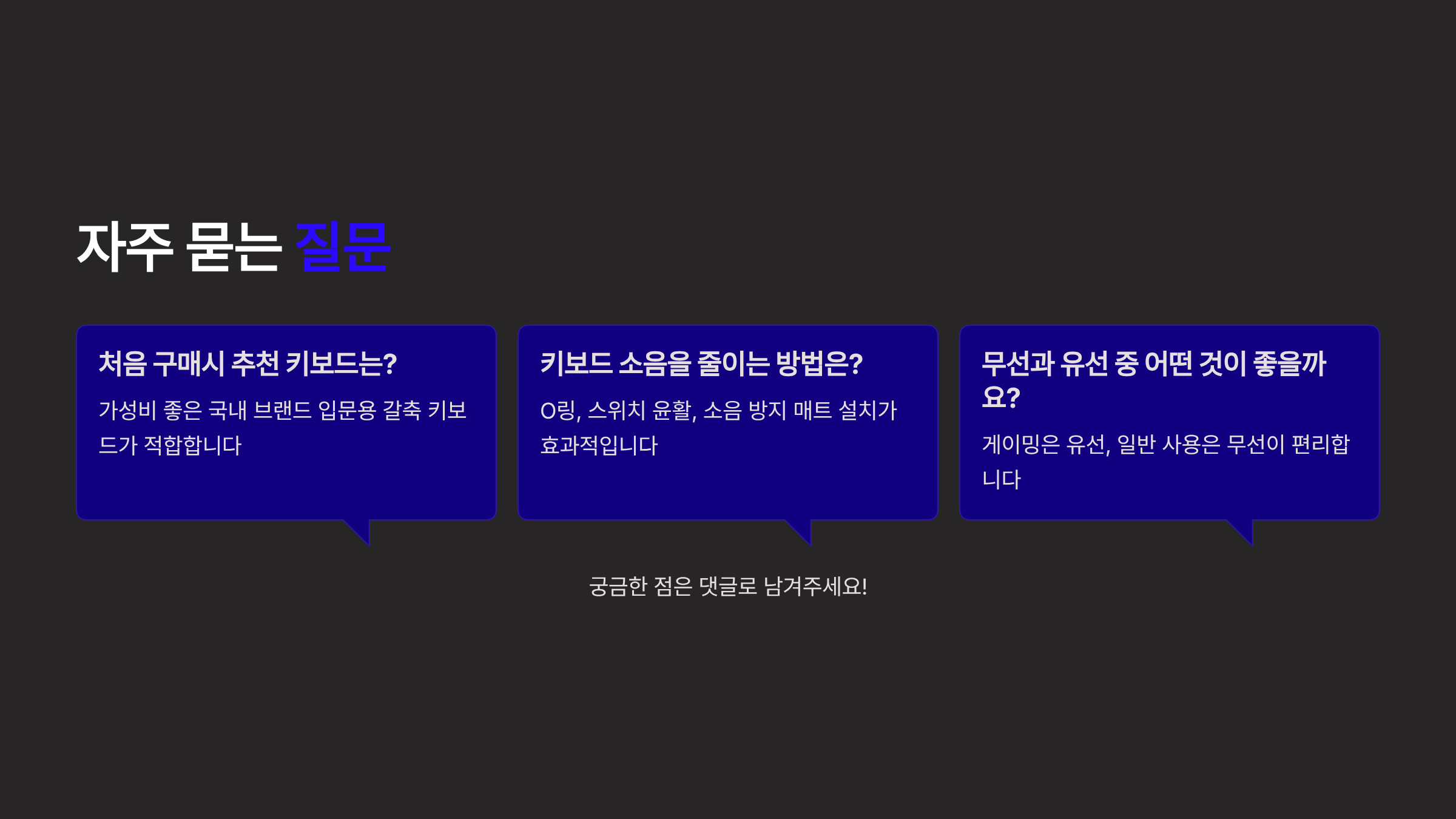 A1. 정답은 없어요! 용도와 환경에 따라 달라지죠. 기계식은 타건감과 내구성이 뛰어나지만 시끄럽고 비싸요. 멤브레인은 조용하고 저렴하지만 타건감이 떨어져요. 사무실이나 공용 공간에서는 멤브레인이나 저소음 기계식을, 개인 공간에서 타이핑을 즐긴다면 기계식을 추천해요. 처음이라면 갈축부터 시작해 보세요!