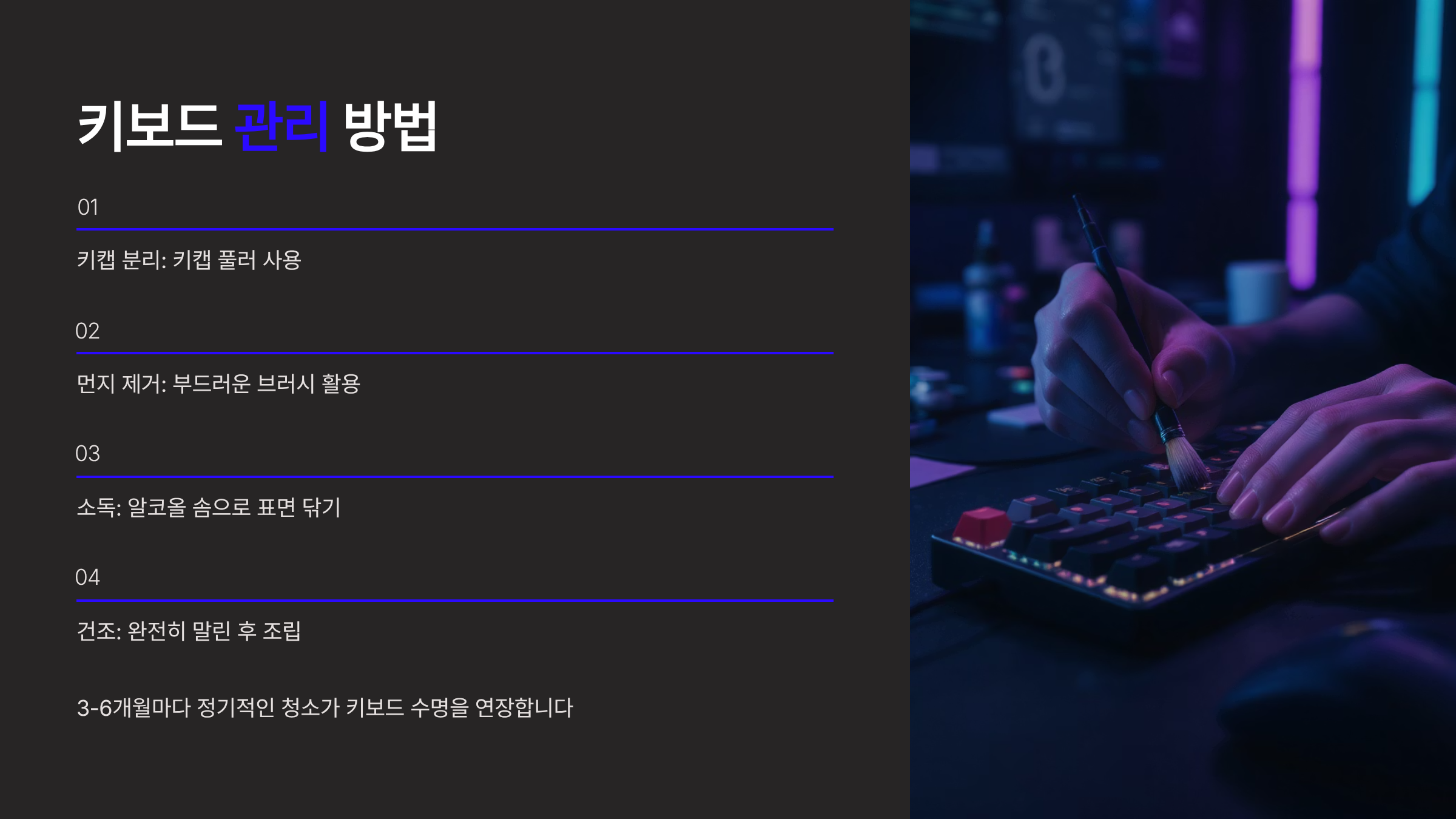 보관할 때는 먼지 커버를 씌우거나 박스에 넣어두세요. 직사광선이나 고온 다습한 곳은 피하고, 평평한 곳에 놓아야 해요. 장기간 사용하지 않을 때는 배터리를 빼두는 게 좋아요. 기계식 키보드는 가끔 작동시켜 주면 스위치가 굳는 것을 방지할 수 있답니다. 소중한 키보드, 잘 관리해서 오래오래 쓰세요! 💎