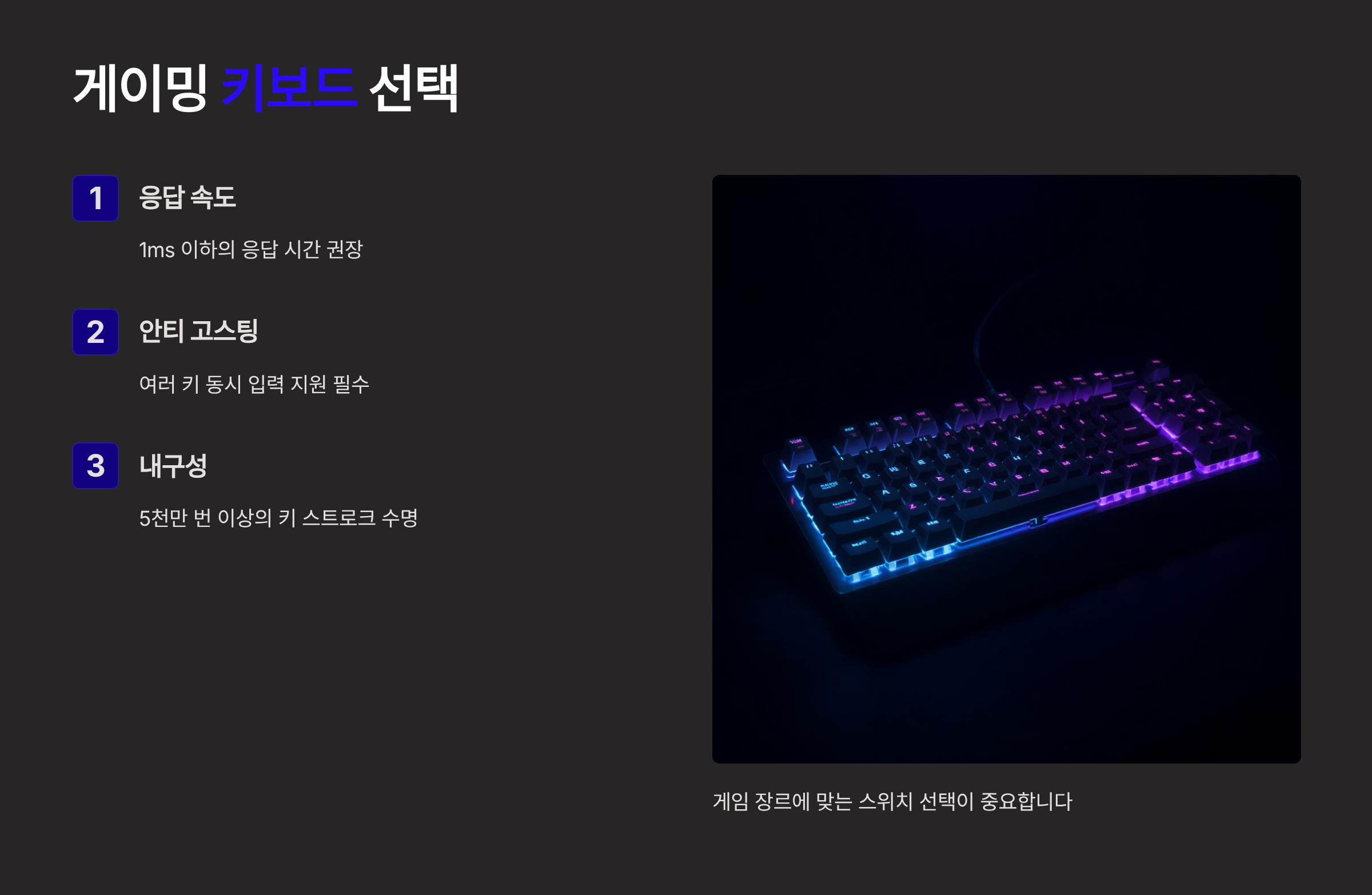 게이밍 키보드는 일반 키보드와 달리 빠른 반응속도와 동시입력, 내구성이 중요해요. 프로게이머들은 0.1초의 차이가 승부를 가르기 때문에 장비 선택에 신중하죠. RGB 조명은 단순한 장식이 아니라 게임별로 키를 구분하는 실용적 기능이기도 해요. 가격대는 5만 원부터 50만 원까지 천차만별이니 용도와 예산을 고려해서 선택하세요! 🎯