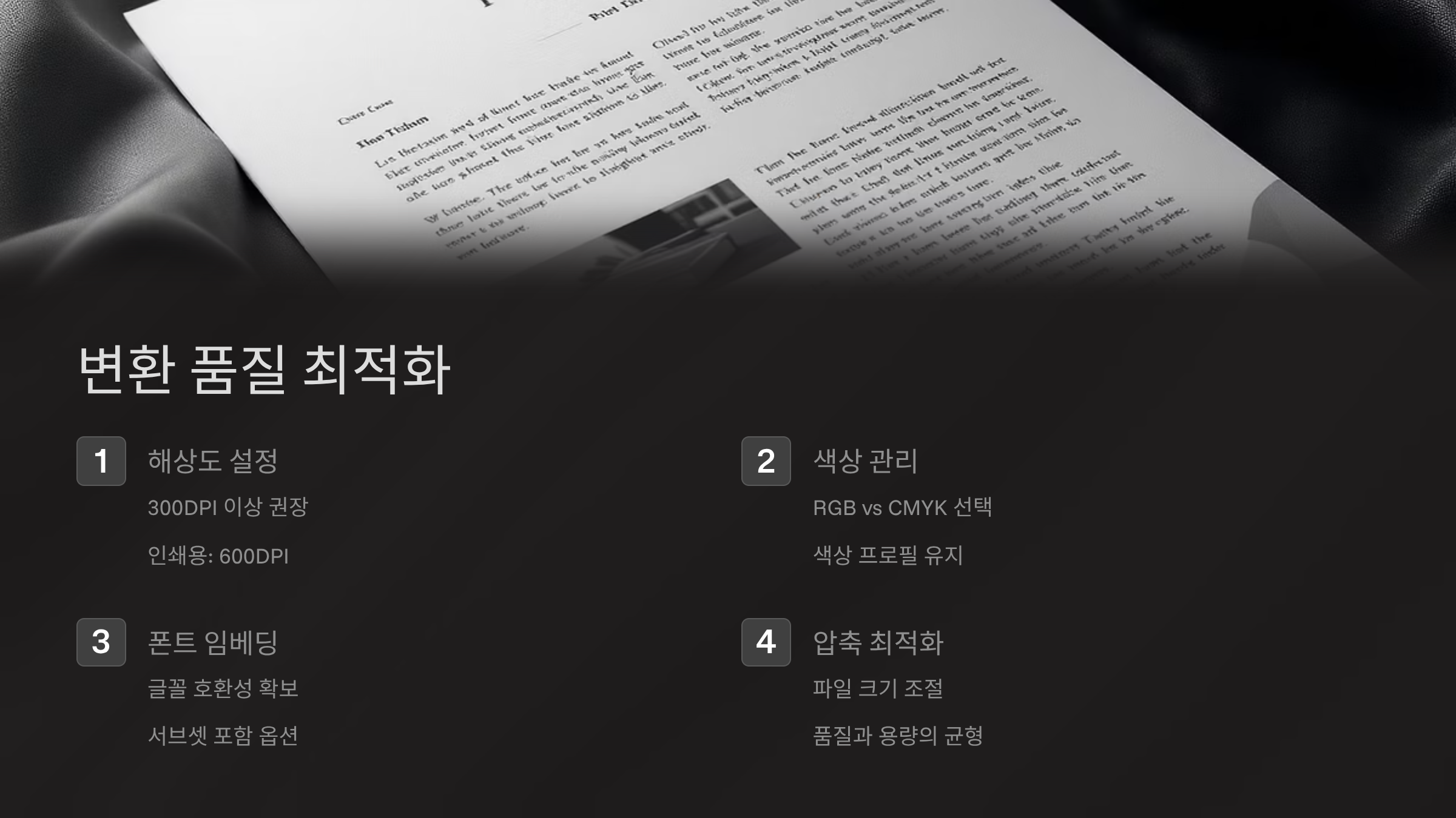 원본 PDF의 품질이 가장 중요해요. 텍스트 기반 PDF는 변환이 쉽지만, 스캔한 이미지 PDF는 OCR 처리가 필요해요. 스캔 해상도는 최소 300 DPI 이상이어야 좋은 OCR 결과를 얻을 수 있답니다. 문서가 기울어져 있거나 얼룩이 있으면 변환 전에 이미지 보정을 하는 것이 좋아요.