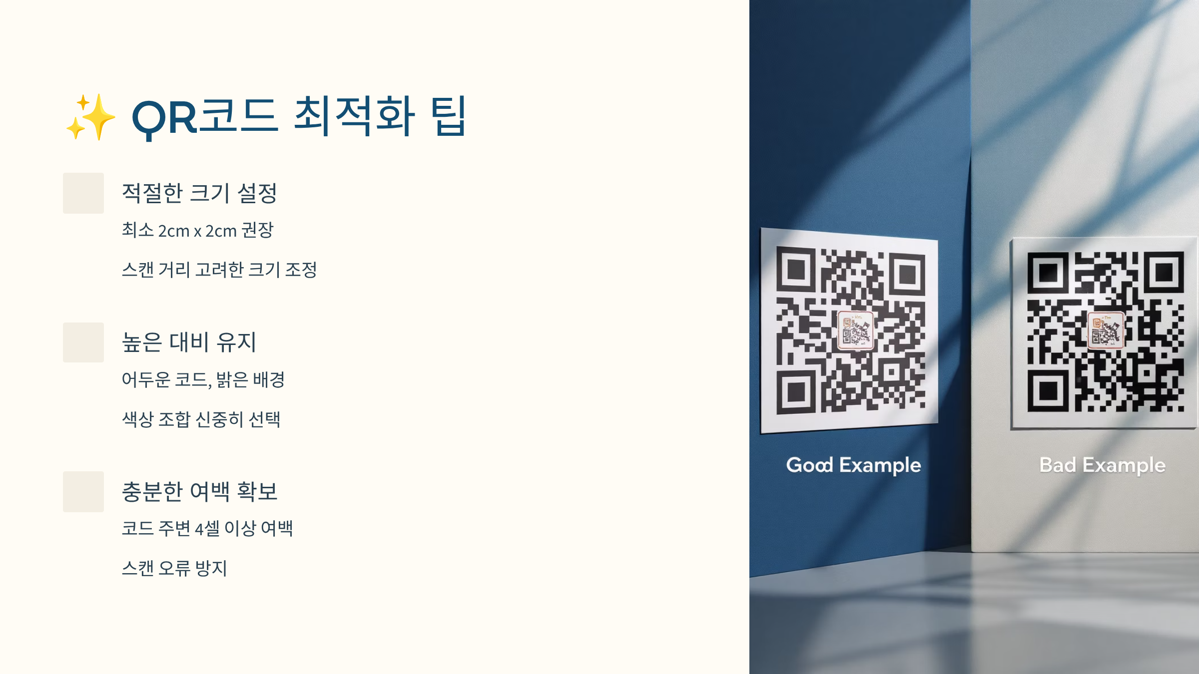 A5. 최소 2cm x 2cm는 되어야 안정적으로 인식돼요. 스캔 거리가 멀수록 크게 만들어야 해요. 일반적으로 스캔 거리의 1/10 크기를 권장해요. 명함은 2.5cm, 포스터는 10cm, 옥외 광고는 50cm 이상이 적당해요. 인쇄 해상도는 300 dpi 이상을 유지하세요.