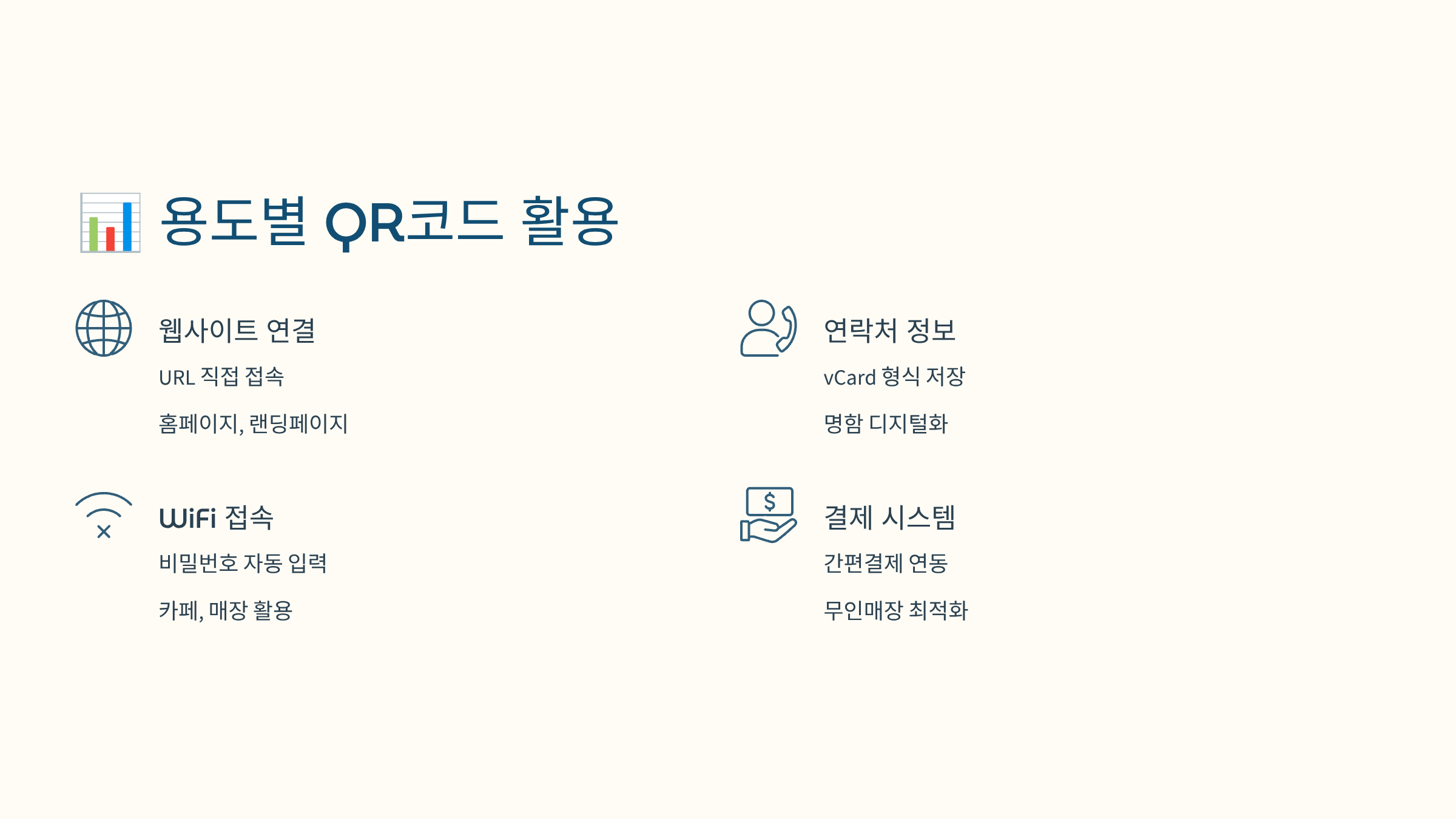QR코드는 담는 정보의 종류에 따라 여러 타입으로 나뉘어요. 각 타입마다 최적화된 용도가 있고, 스캔했을 때 동작도 달라요. 단순히 웹사이트로 연결하는 것부터 와이파이 자동 연결, 결제 정보 전달까지 정말 다양한 활용이 가능해요. 실생활에서 자주 사용되는 QR코드 타입들을 자세히 알아볼게요.