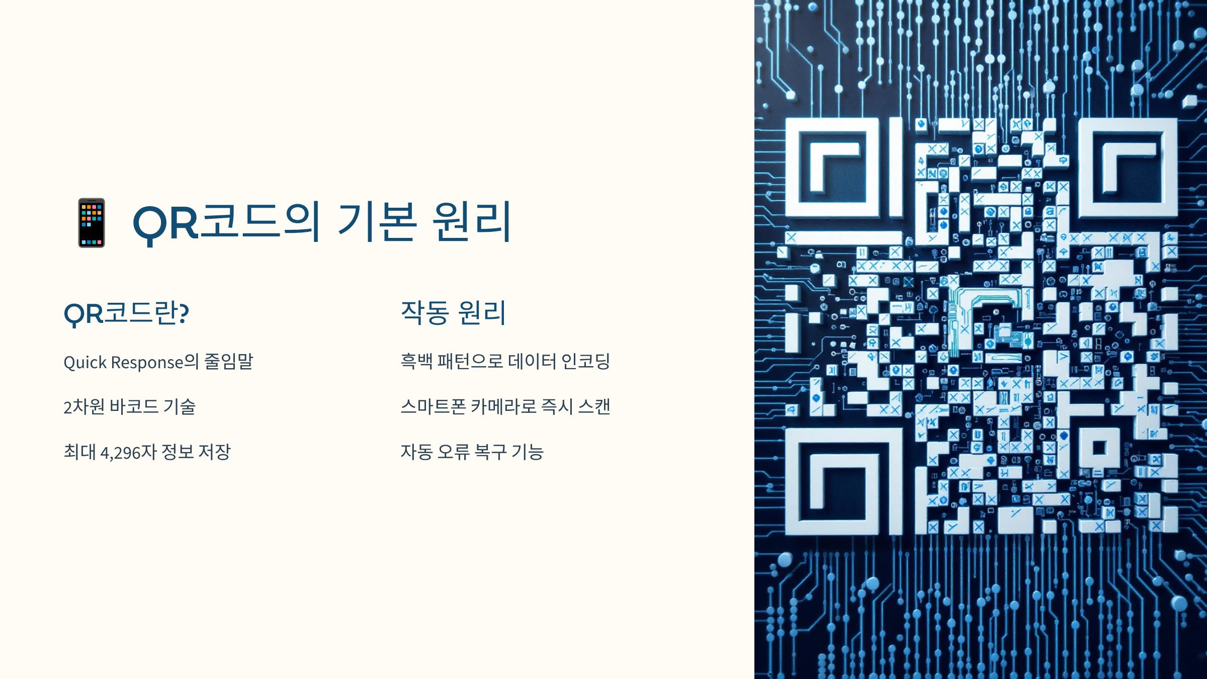 QR코드는 1994년 일본 덴소웨이브사가 개발한 2차원 바코드로, Quick Response의 약자예요. 처음에는 자동차 부품 관리를 위해 만들어졌지만, 지금은 우리 일상 곳곳에서 활용되고 있어요. 스마트폰 카메라로 간단히 스캔하면 웹사이트, 연락처, 와이파이 정보 등 다양한 데이터에 즉시 접근할 수 있답니다.