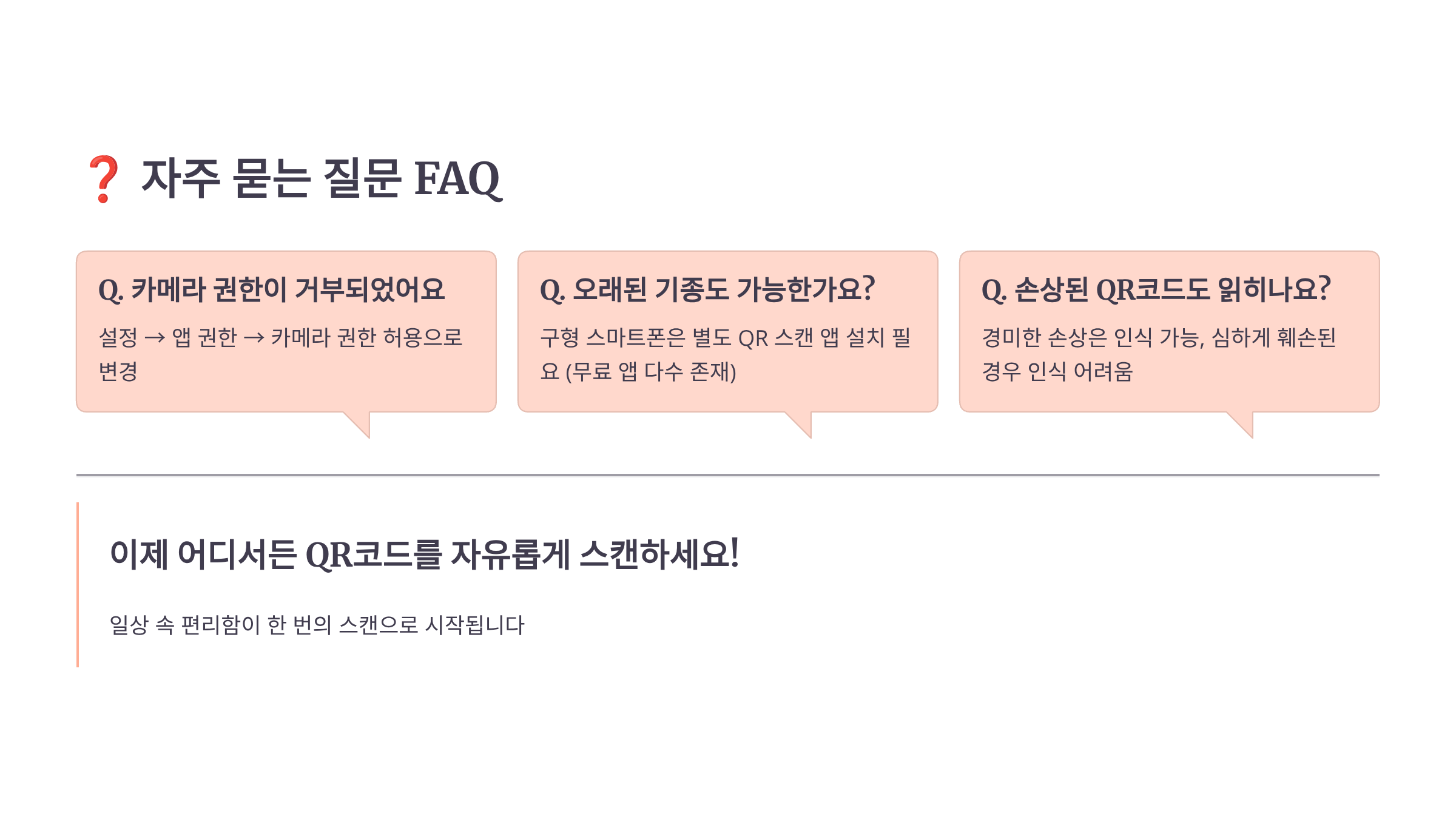 | 손상된 QR코드 | 코드 자체 문제 | 새 QR코드 요청 |