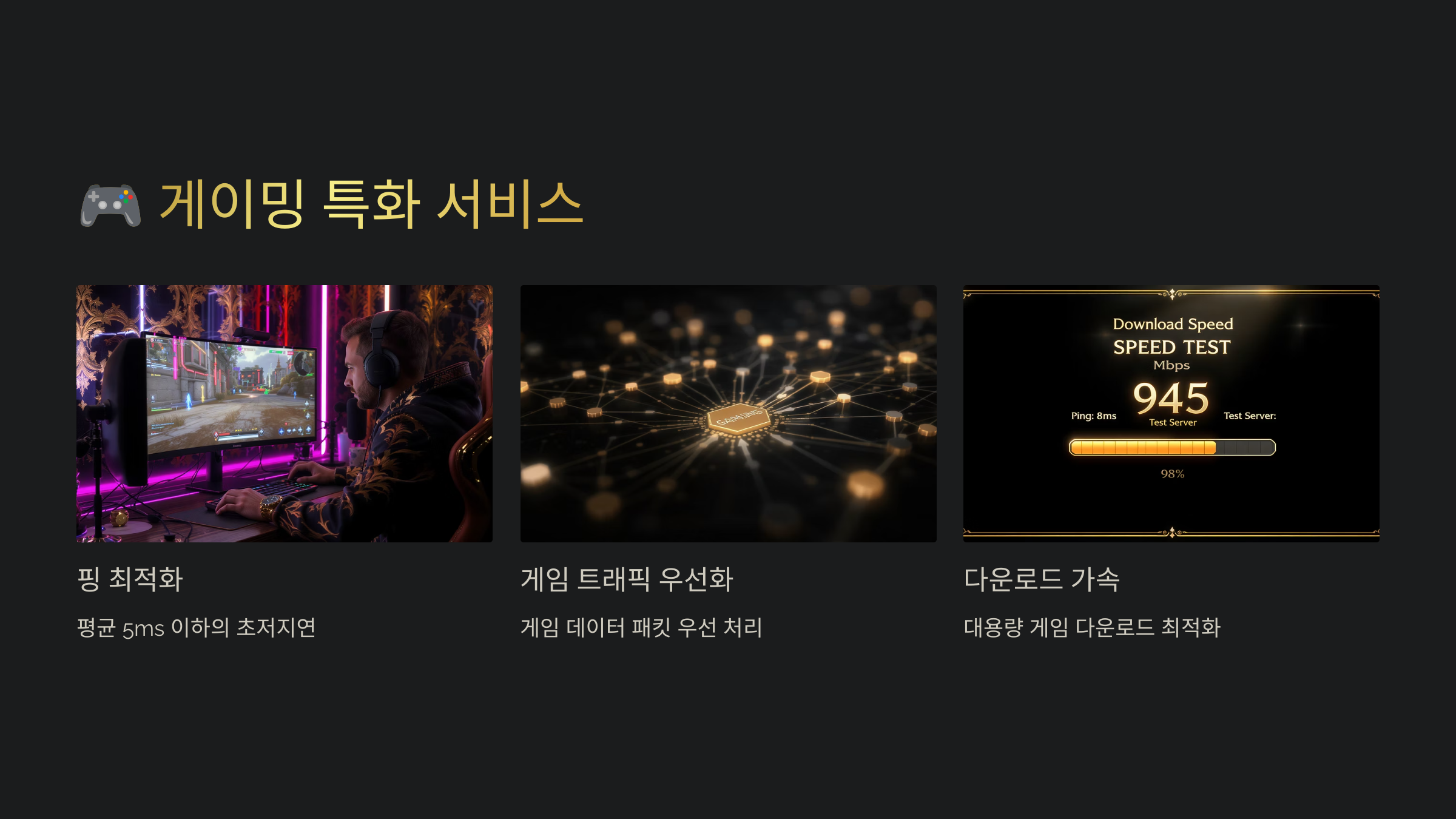 SK브로드밴드는 게이머들을 위한 특별한 서비스를 제공하고 있어요. '게이밍 팩'이라는 이름으로 출시된 이 서비스는 단순히 빠른 인터넷 속도만 제공하는 것이 아니라, 게임 플레이에 최적화된 네트워크 환경을 구축해 준답니다. 특히 FPS나 MOBA 같은 실시간 대전 게임에서 중요한 핑(Ping)을 최소화하는 기술이 적용되어 있어요. 일반 인터넷 서비스와 달리 게임 트래픽을 우선 처리하는 QoS(Quality of Service) 기능이 탑재되어 있어서, 가족이 동영상을 시청하더라도 게임 플레이에는 영향이 없답니다.