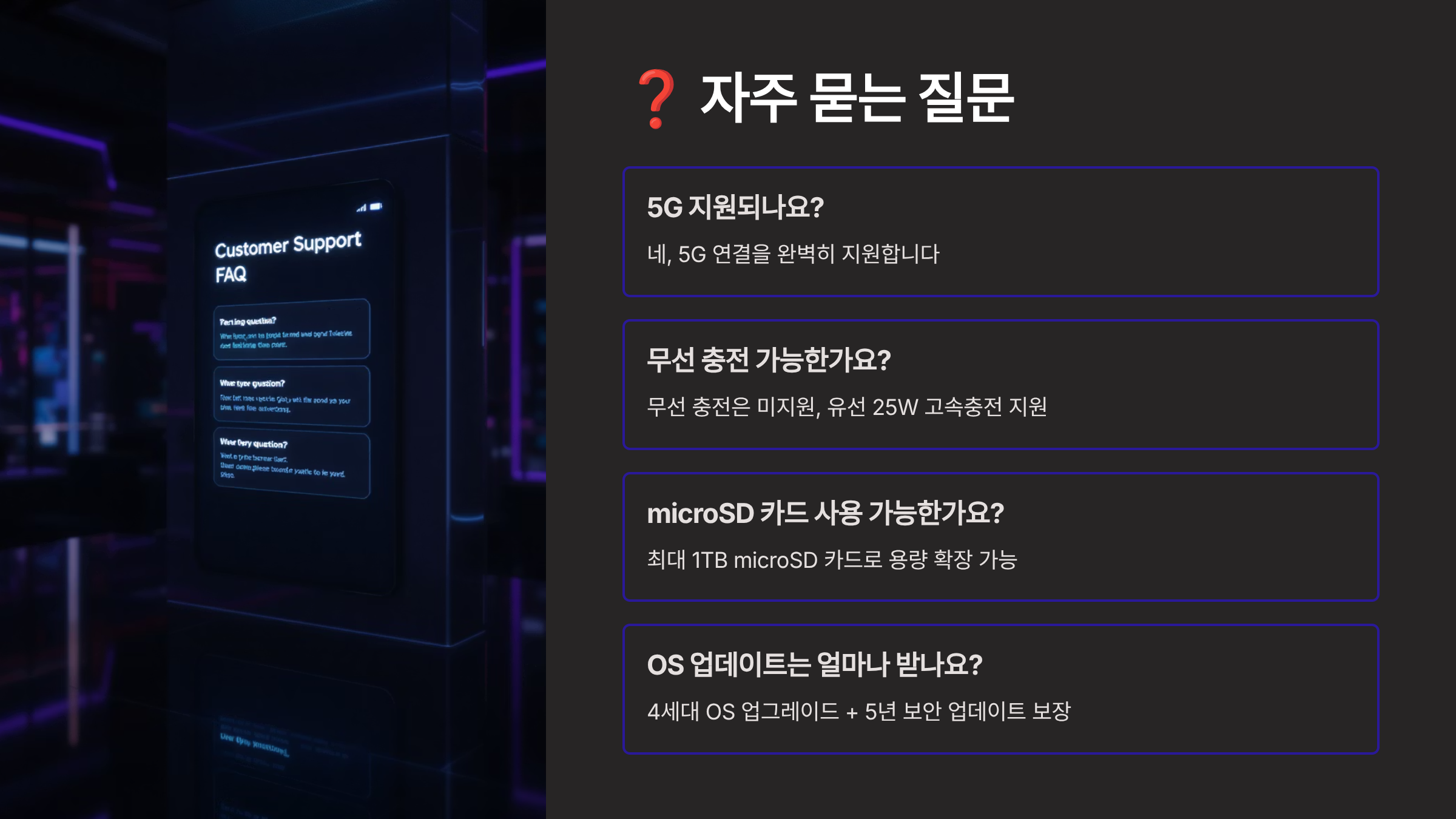 A8. 아쉽게도 무선충전은 지원하지 않아요. 25W 유선 고속충전만 가능하며, 충전기는 별도 구매가 필요해요.