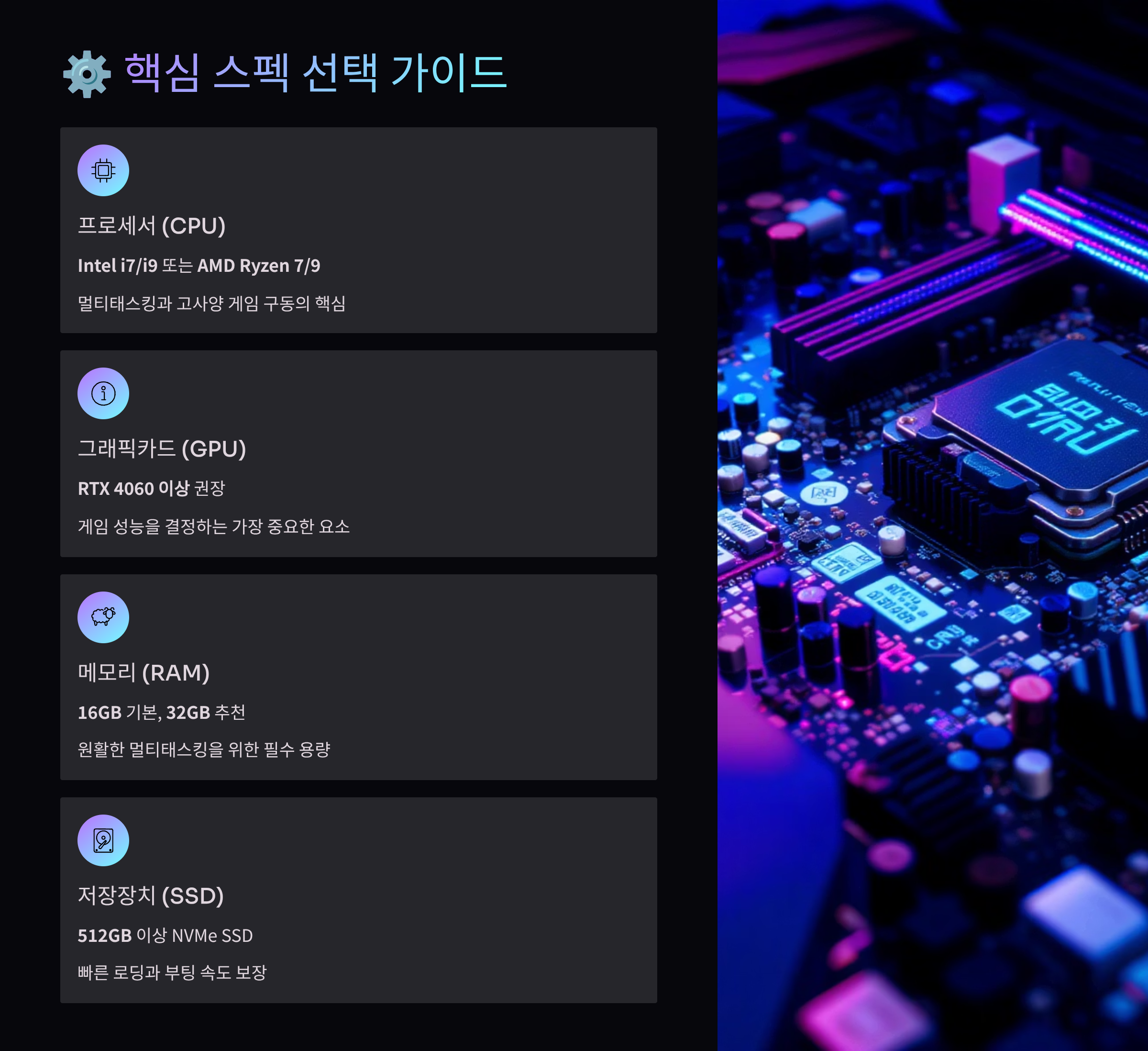 게이밍노트북을 선택할 때 가장 중요한 것은 CPU와 GPU의 조합이에요. 2025년 기준으로 인텔 14세대 코어 i7-14700HX나 AMD 라이젠 9 8945HS 정도면 대부분의 게임을 원활하게 구동할 수 있어요. CPU는 게임 외에도 스트리밍, 영상편집, 멀티태스킹에 큰 영향을 미치므로 용도에 맞게 선택하는 것이 중요해요. 게임만 한다면 i5나 라이젠 7도 충분하지만, 크리에이티브 작업을 병행한다면 상위 모델을 추천해요.