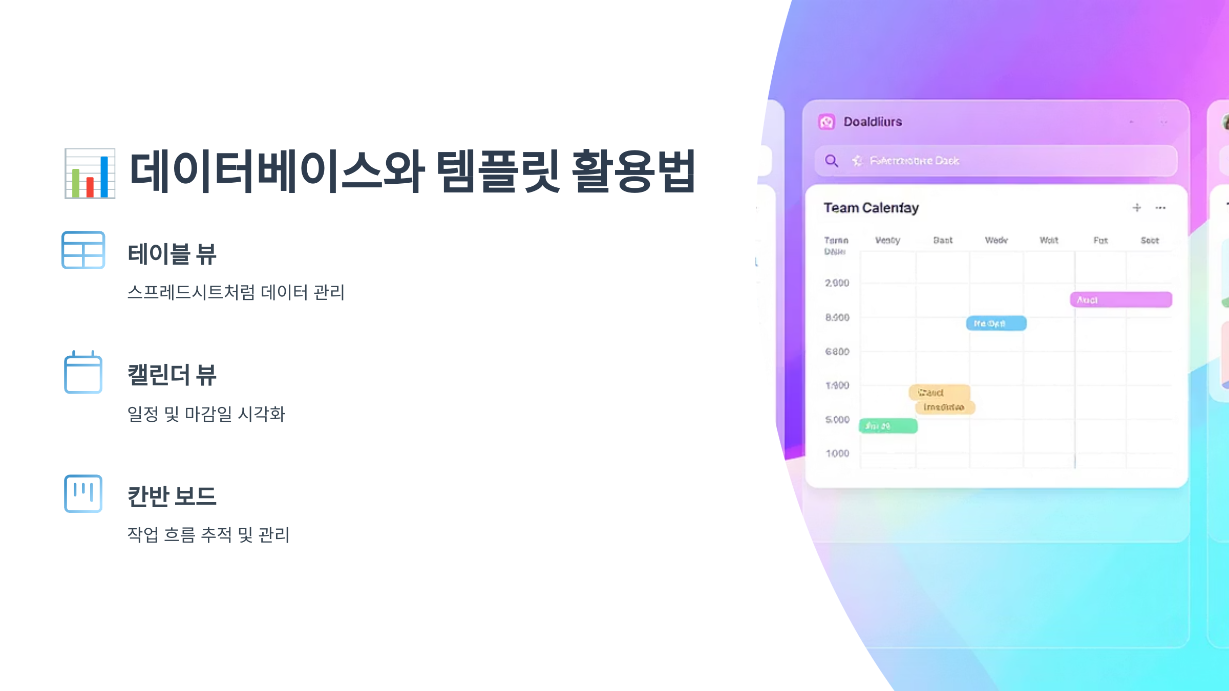 노션의 또 다른 특징은 강력한 데이터베이스 기능이에요. 테이블, 보드, 갤러리, 리스트, 캘린더, 타임라인 등 6가지 뷰를 제공하며, 같은 데이터를 다양한 관점에서 볼 수 있답니다. 필터, 정렬, 그룹화 기능을 통해 원하는 정보만 빠르게 찾을 수 있고, 관계형 데이터베이스처럼 테이블 간 연결도 가능해요.