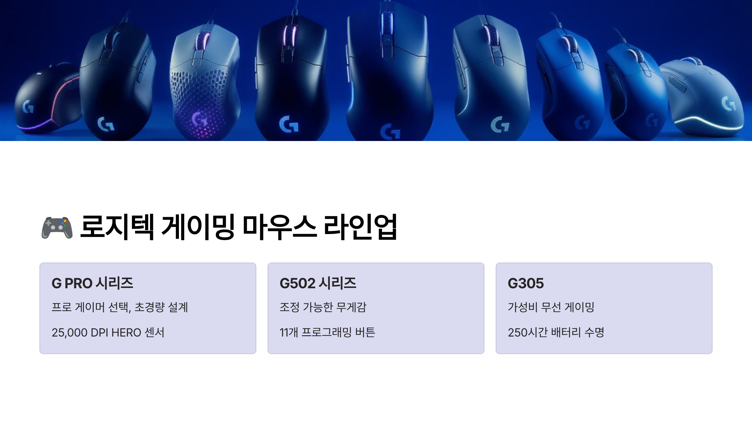 로지텍 G 시리즈는 프로게이머들과 함께 개발한 전문 게이밍 마우스 라인업이에요. G Pro X Superlight는 63g의 초경량 무게로 FPS 게임에 최적화되어 있고, 많은 e스포츠 선수들이 실제로 사용하고 있답니다. HERO 25K 센서를 탑재해 최대 25,600 DPI까지 지원하며, 1ms의 응답속도로 즉각적인 반응을 보여줘요. 배터리는 한 번 충전으로 70시간 사용 가능해요.