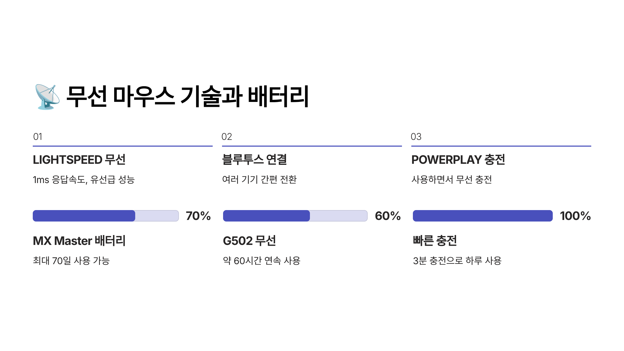 | 충전식 | 가벼움, 친환경 | 주기적 충전 | MX Master, G Pro |