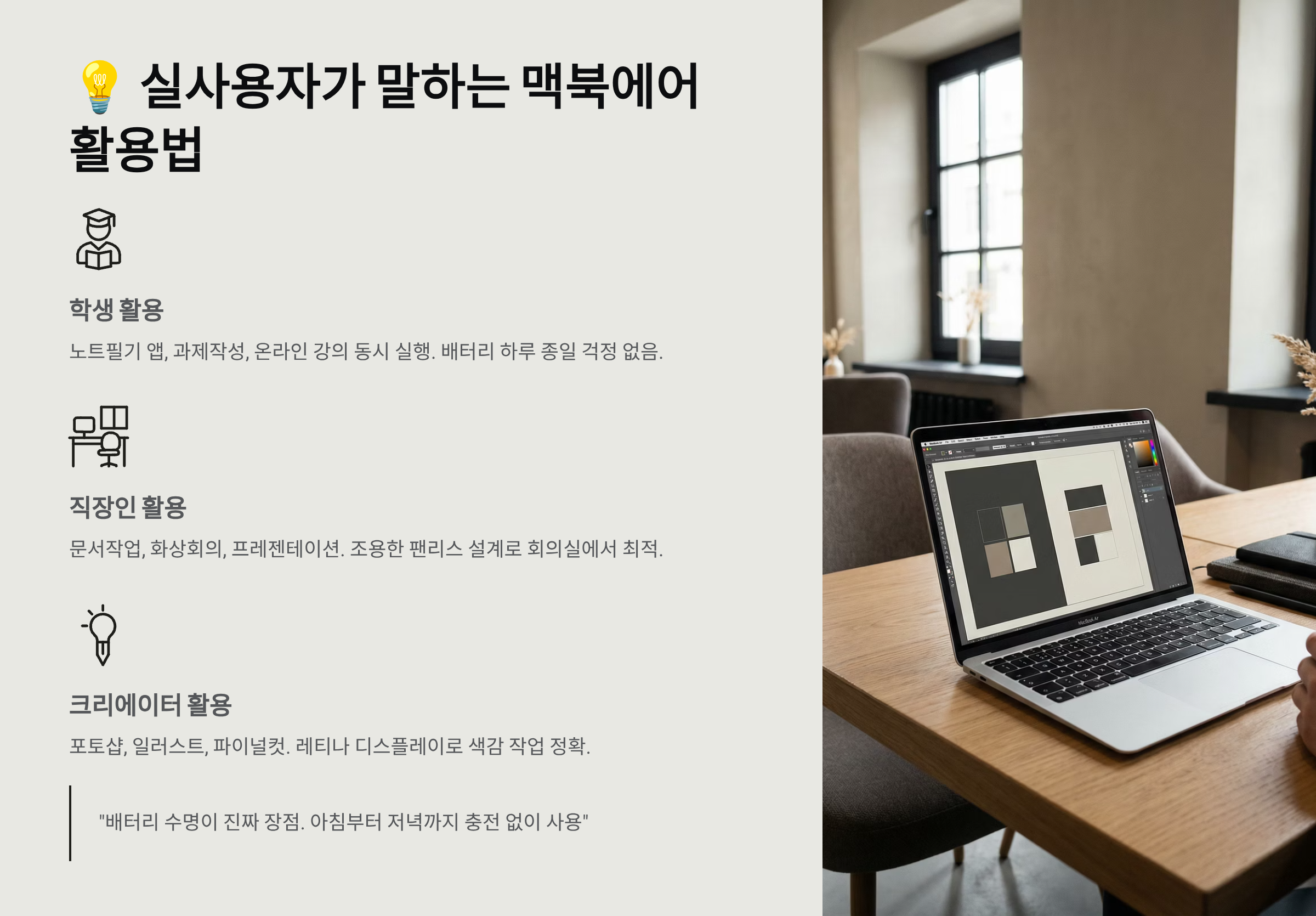 카페에서 하루 종일 작업해도 충전기가 필요 없고, 지하철에서도 무릎 위에 올려놓고 편하게 사용할 수 있어요. 아이폰으로 찍은 사진이 자동으로 동기화되어 바로 편집 가능하고, 에어드롭으로 파일 전송도 순식간이에요. 특히 재택근무나 노매드 라이프를 즐기는 분들에게 최고의 파트너가 될 거예요!