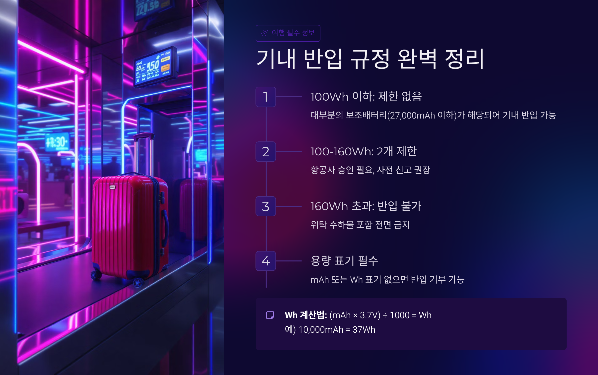 기내 반입 가능 여부는 배터리 용량(Wh)으로 판단해요. 보조배터리에 표기된 mAh와 전압(V)을 곱한 후 1000으로 나누면 Wh가 나와요. 예를 들어 10000mAh, 3.7V 배터리라면 10000 x 3.7 / 1000 = 37Wh가 되는 거죠.