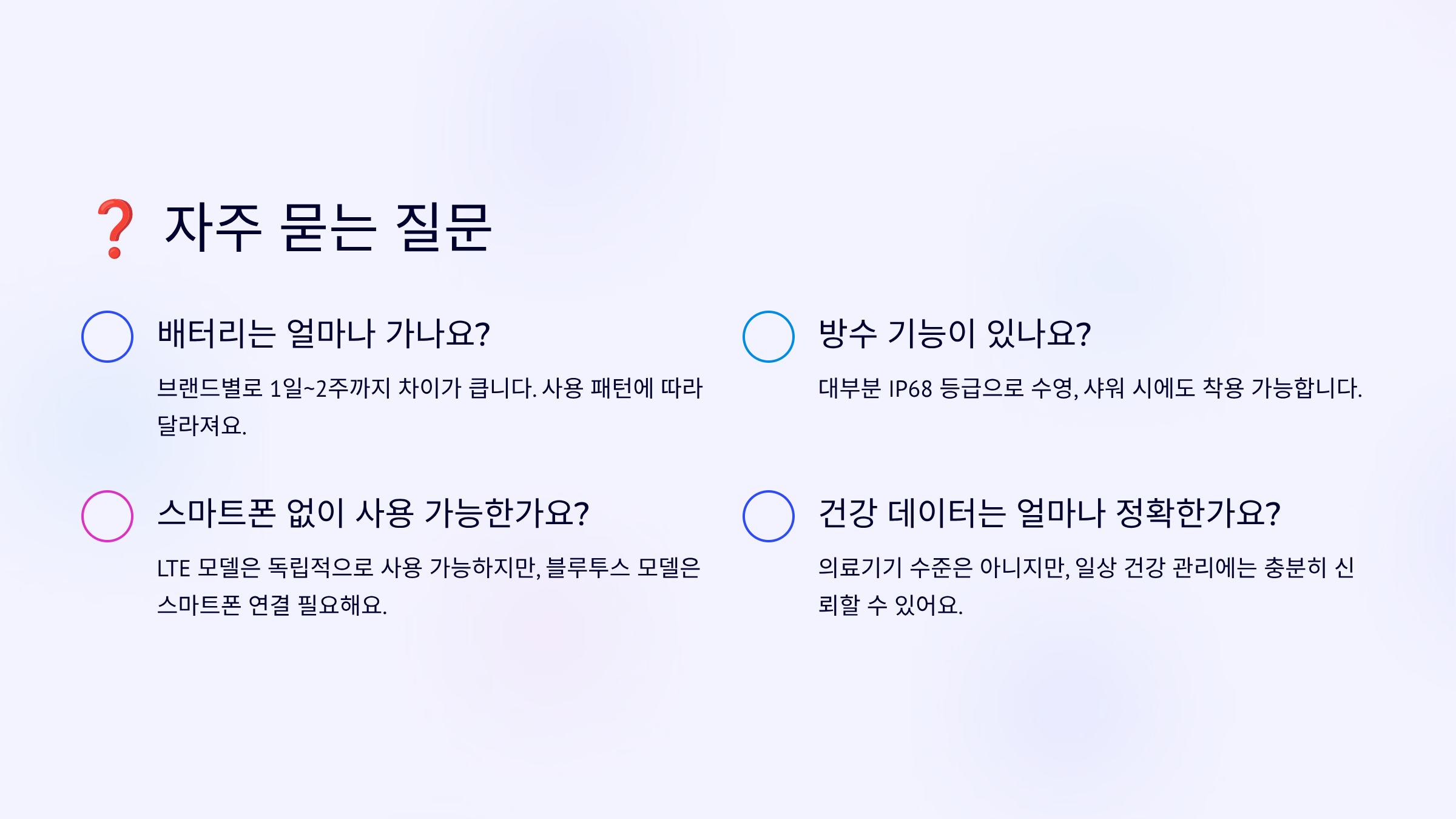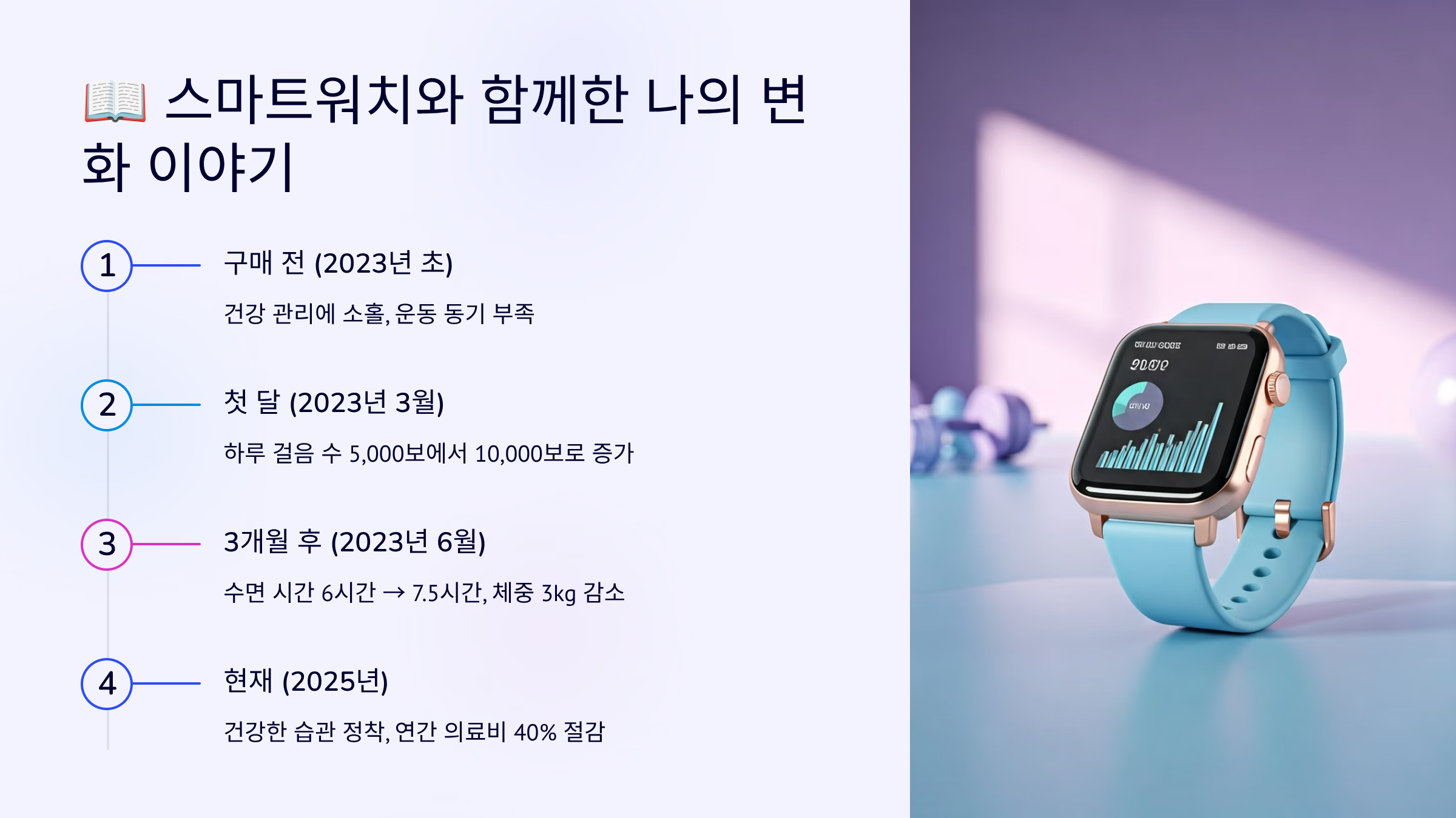 장기적으로 보면 스마트워치를 사용하지 않는 것은 건강 관리 비용의 증가로 이어질 수 있어요. 예방적 건강 관리가 안 되니까 병이 커진 후에야 병원을 찾게 되고 치료 비용이 더 많이 들어요. 스마트워치로 이상 징후를 조기에 발견했더라면 간단한 생활습관 개선으로 해결될 일이 큰 치료가 필요한 상황이 되는 거예요. 투자 대비 가성비를 생각하면 스마트워치는 건강 보험과 같은 역할을 해요.