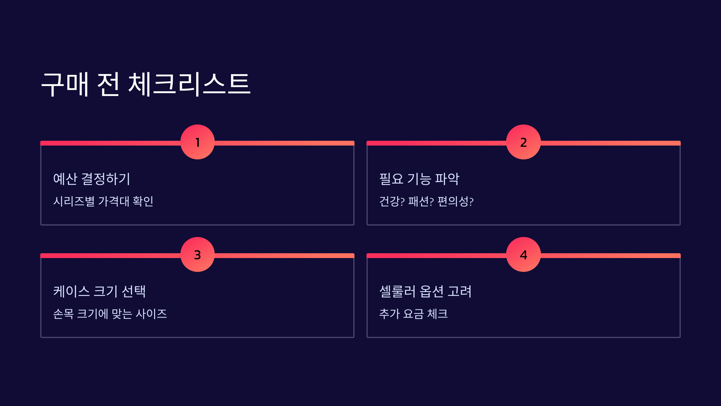 건강 기능 활용 계획을 세워보세요. 심전도, 혈중 산소 측정 같은 고급 기능을 쓸 건지, 기본적인 활동 추적만 필요한지 생각해 보세요. 고급 건강 기능이 필요 없다면 SE 모델도 충분해요. 반대로 건강 관리가 주목적이라면 최신 시리즈를 선택하는 게 좋아요. 가족력이 있는 질환 관련 기능을 확인하는 것도 도움이 돼요.