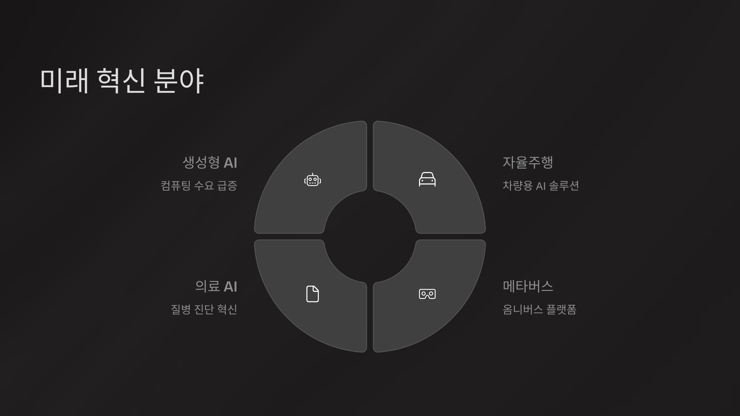 엔비디아의 장기 비전은 'AI 팩토리'를 만드는 것이에요. 기업들이 데이터를 입력하면 AI 모델과 인사이트를 생산해 내는 공장 같은 개념이랍니다. 이를 위해 하드웨어, 소프트웨어, 서비스를 통합한 턴키 설루션을 제공할 계획이에요. DGX Cloud 같은 서비스형 AI(AIaaS)도 확대될 예정이랍니다. 미래에는 모든 기업이 AI 기업이 될 것이고, 엔비디아는 그 인프라를 제공하는 핵심 파트너가 되려고 해요! 🌟