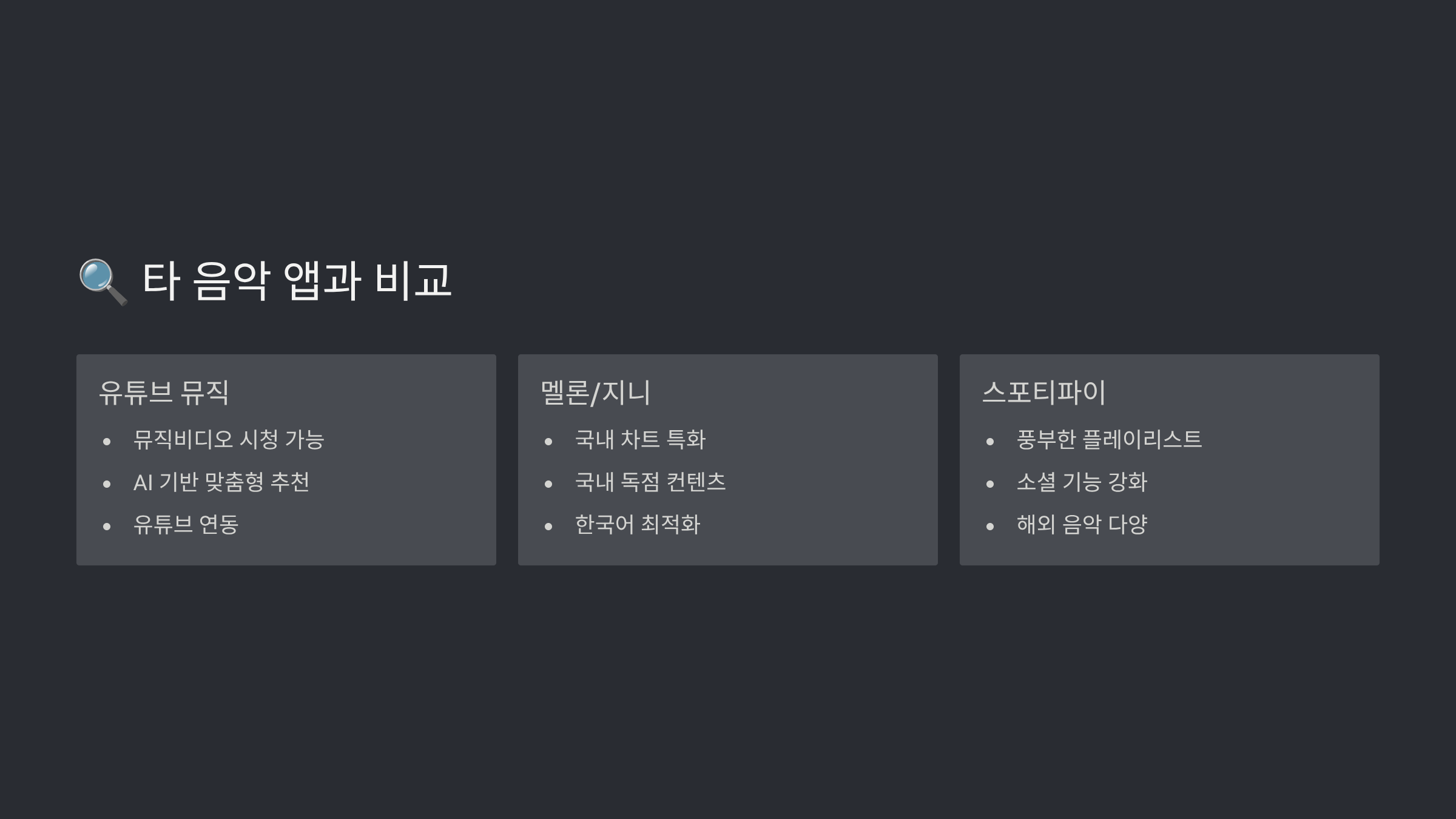 | 스포티파이 | 10,900원 | 추천 알고리즘 | 한국 음원 부족 |