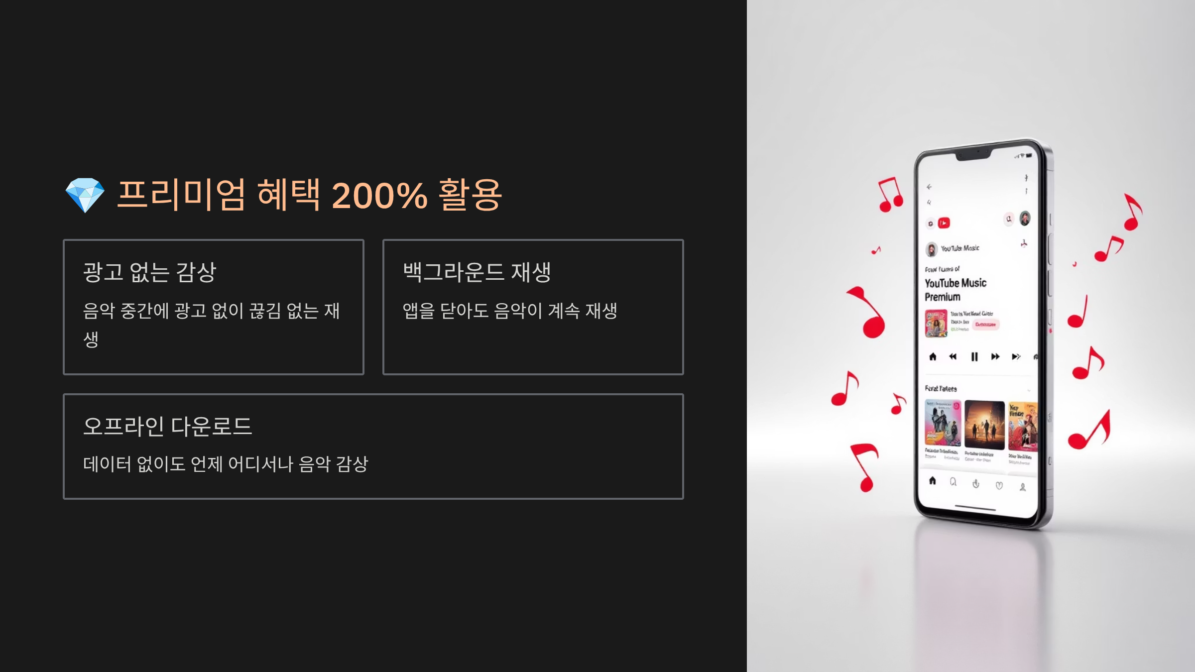 유튜브뮤직 프리미엄은 단순히 광고 제거만이 아니에요. 월 8,690원(iOS는 11,500원)의 가격으로 누릴 수 있는 혜택이 정말 많답니다. 가장 큰 장점은 백그라운드 재생이에요. 다른 앱을 사용하거나 화면을 꺼도 음악이 계속 재생되니까 배터리도 아끼고 멀티태스킹도 가능해요.