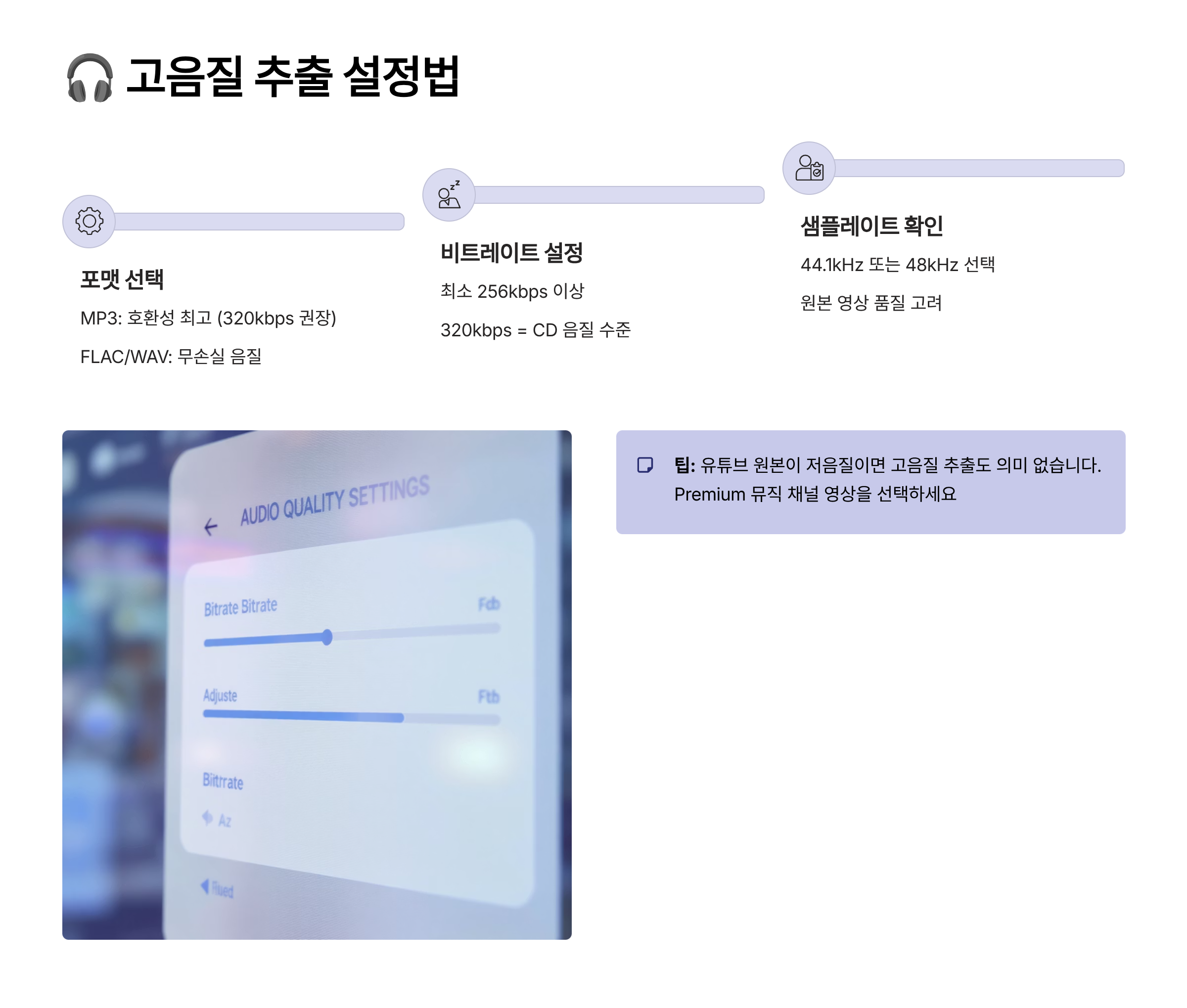 최적의 추출 설정을 알아볼게요. 원본이 128 kbps라면 320 kbps로 변환해도 의미가 없어요. 원본과 같거나 약간 낮은 비트레이트를 선택하는 것이 효율적이에요. 포맷은 호환성을 위해 MP3를, 품질을 위해서는 AAC를 추천해요. 샘플레이트는 44.1kHz나 48kHz가 표준이에요.