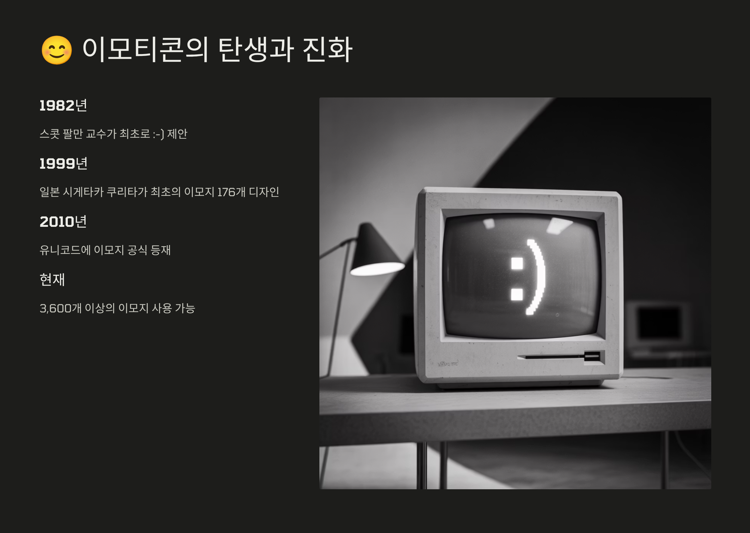 이모티콘은 디지털 시대의 새로운 언어로 자리 잡았어요. 1982년 카네기멜론 대학의 스콧 펄먼 교수가 처음 만든 :-) 기호부터 시작해서, 지금은 수천 개의 다양한 이모지로 발전했답니다. 우리가 매일 사용하는 이 작은 그림들이 어떻게 전 세계 사람들의 소통 방식을 바꾸었는지 함께 알아볼까요? 😊