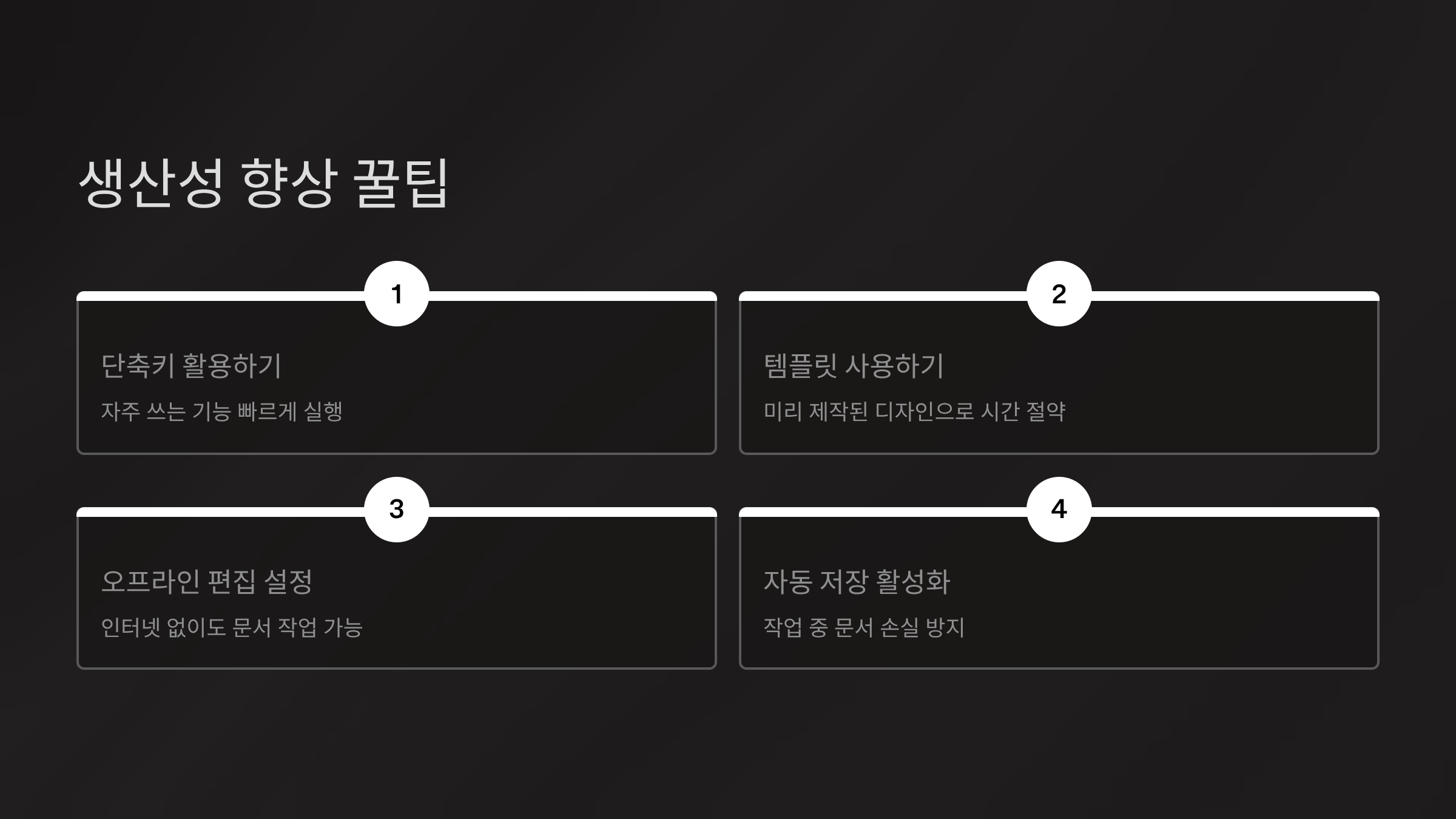 폴라리스오피스를 200% 활용하는 방법을 알려드릴게요. 먼저 단축키를 익히는 것이 중요해요. Ctrl+S(저장), Ctrl+Z(실행 취소), Ctrl+Y(다시 실행) 같은 기본 단축키부터 시작해서 고급 단축키까지 마스터하면 작업 속도가 훨씬 빨라진답니다.