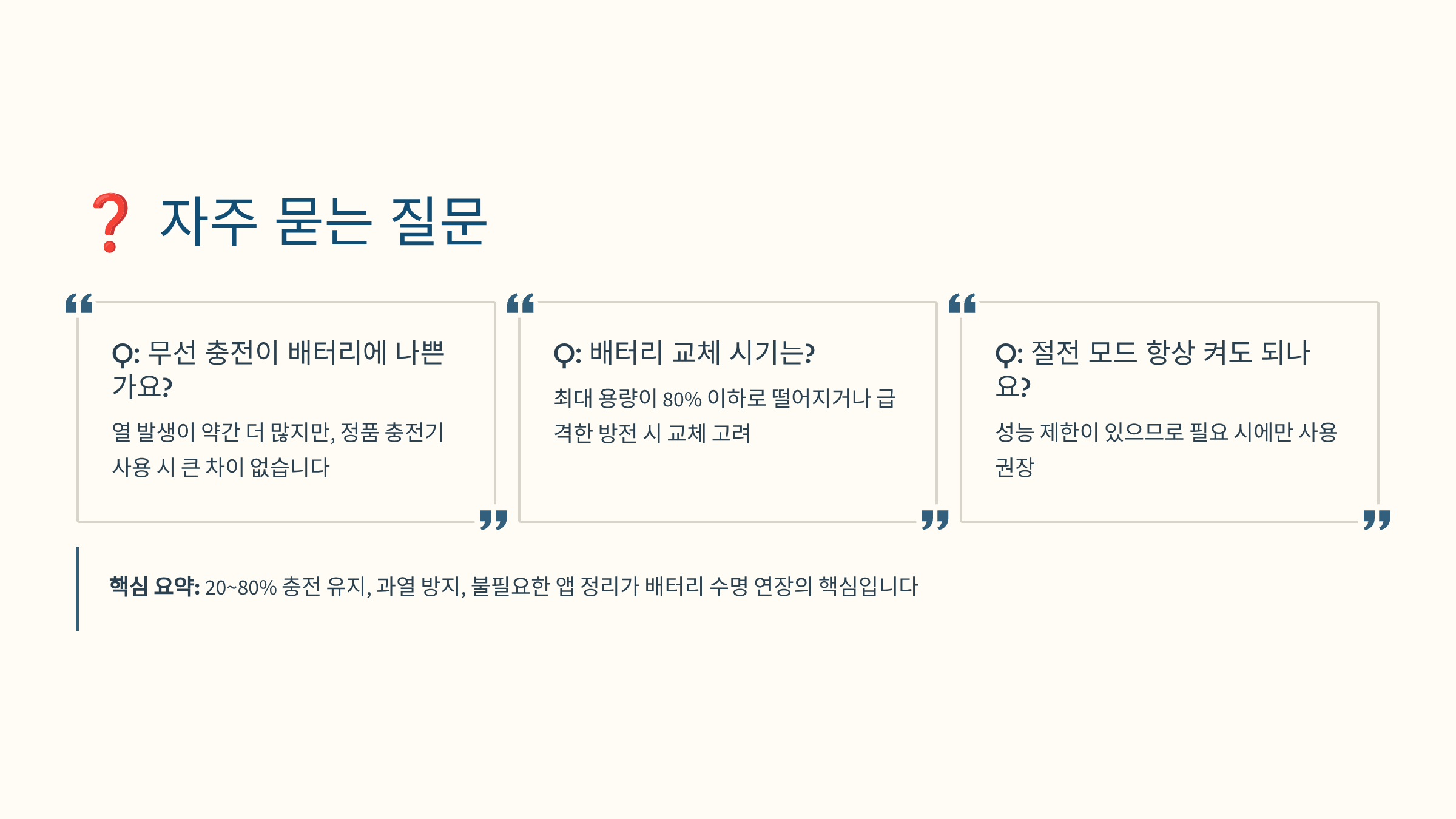 A5. 무선 충전은 에너지 손실이 있고 발열이 더 심해요. 배터리 수명 측면에서는 유선 충전이 더 유리해요. 편의성과 배터리 건강 사이에서 균형을 찾아 사용하세요.