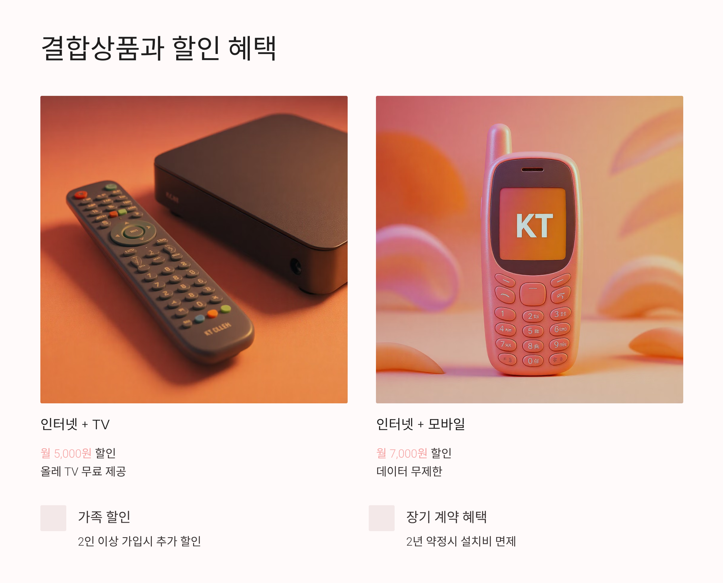 KT의 결합상품은 인터넷, TV, 모바일, 전화를 묶어서 가입하면 큰 할인을 받을 수 있는 상품이에요. 가장 인기 있는 것은 인터넷+TV+모바일 3종 결합인데, 개별 가입 대비 월 3~5만 원 정도 절약할 수 있답니다. 특히 가족 구성원이 많을수록 결합 혜택이 커져요. 4인 가족 기준으로 모바일 4회선과 인터넷, TV를 결합하면 월 10만 원 이상 절감 효과가 있어요! 💰